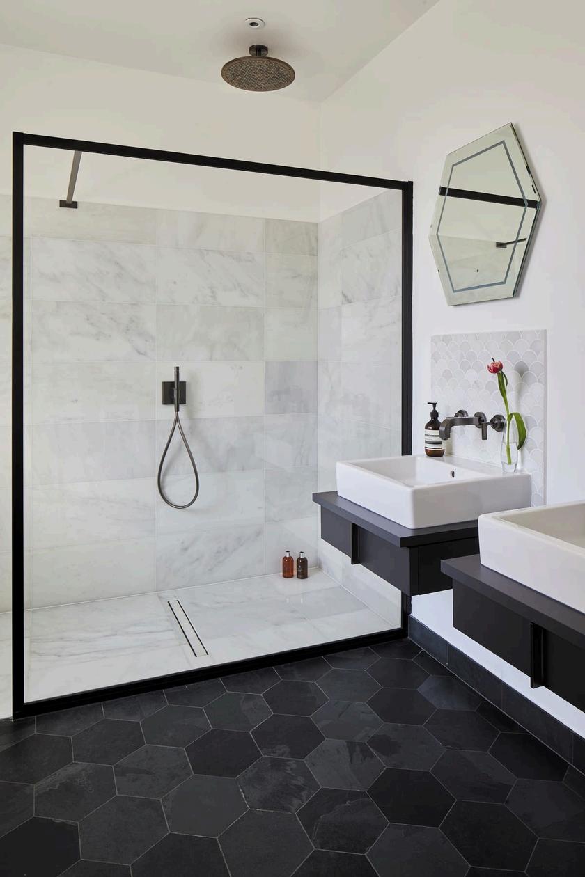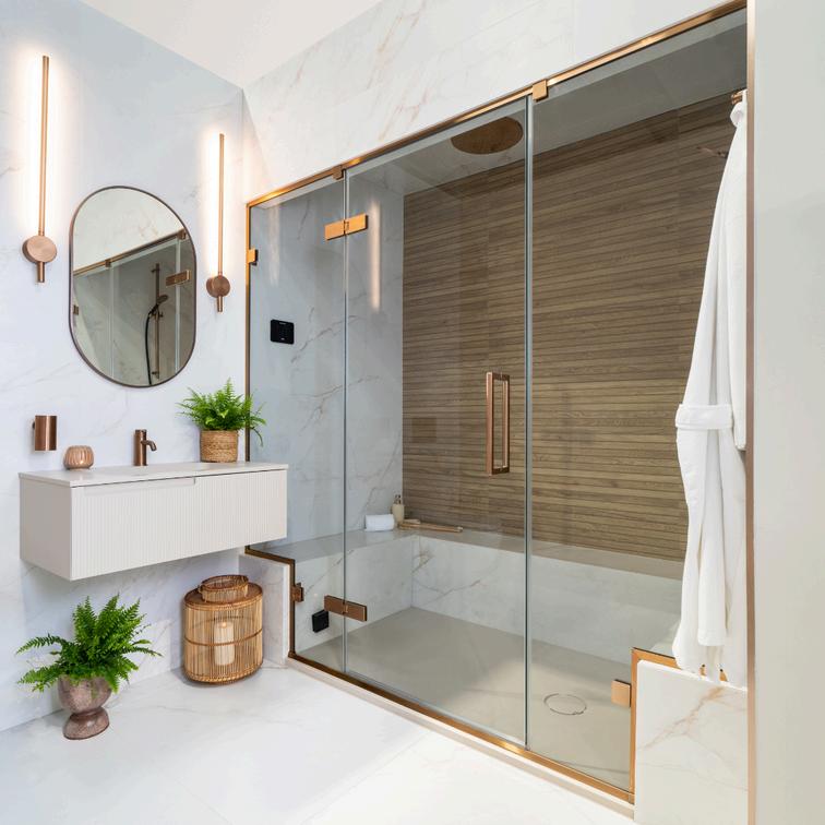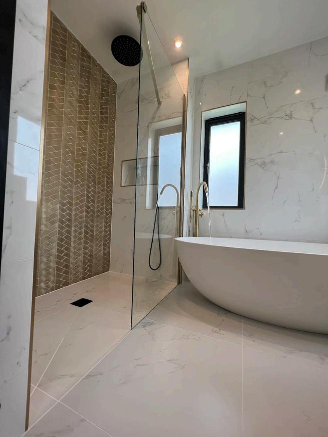 This spacious bathroom showcases a refined balance of elegance and functionality. Expansive marble surfaces with soft grey veining set a luxurious tone, while the walkin shower with rainfall and handheld fittings offers a modernspalikeexperience.Thefreestandingbath,paired withasleekwall‑mountedtapandnichestorage,createsa focalpointofcalmsophistication.