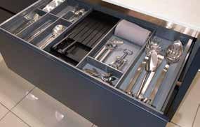 Drawer organisation for cutlery and utensils is available in a variety of different sizes and finishes. Your retailer will advise, to suit the width of your drawers.