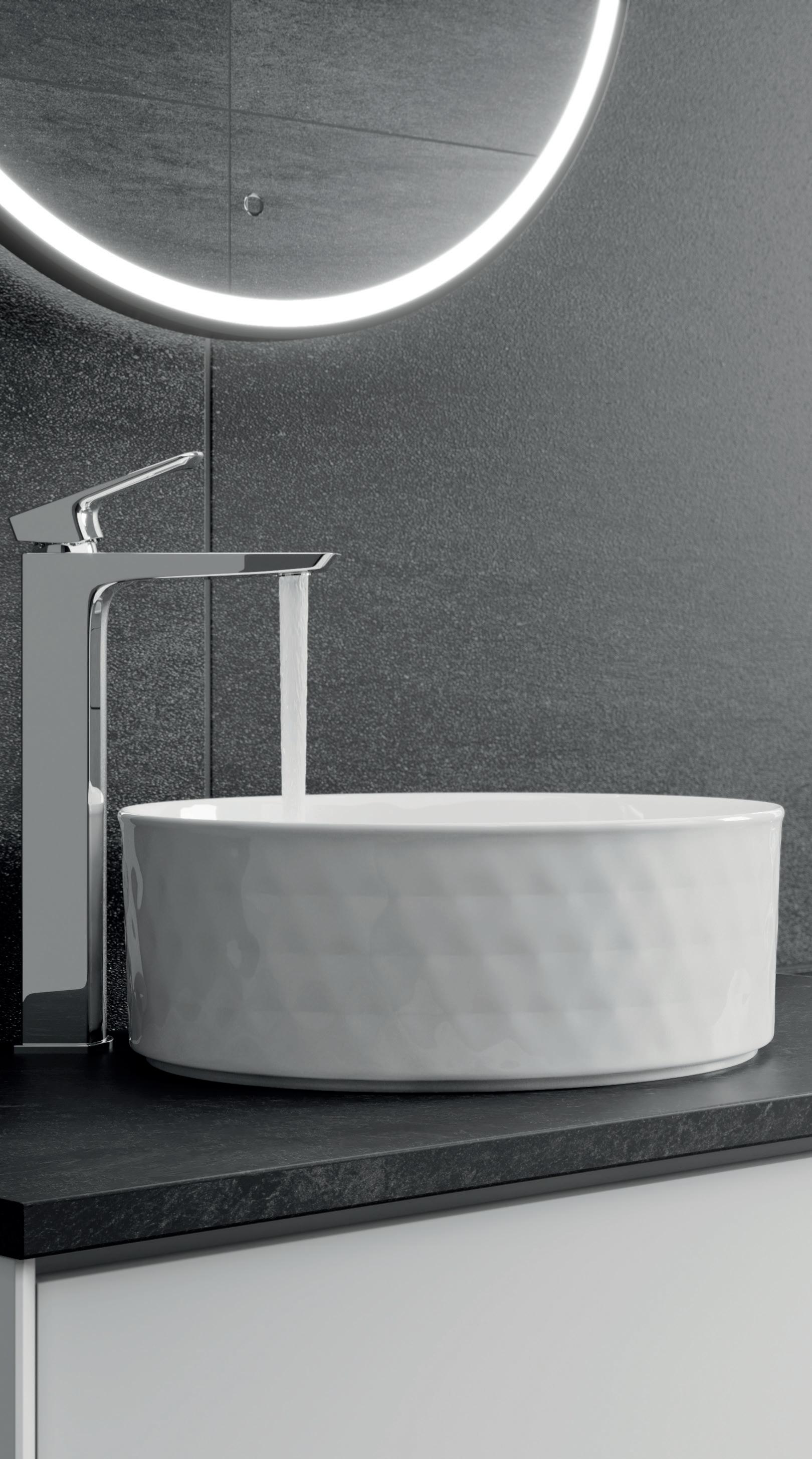 Black is your building block here, whether used as an accent colour in your brassware and fixtures or in a statement piece like our Petro basin. Choose soft, coloured furniture or warm wood textures to finish the look.