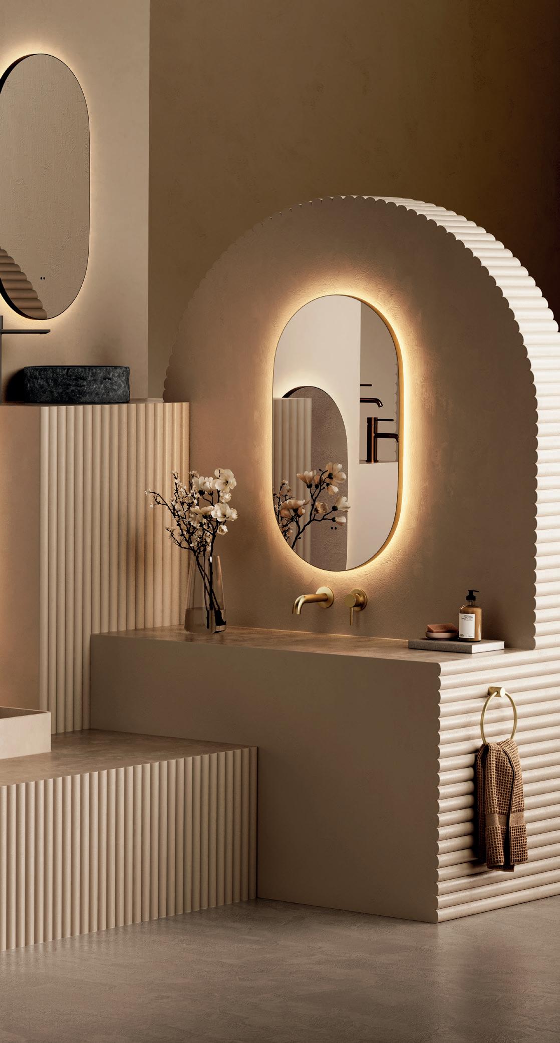 Choose soft, neutral-toned furniture with brushed brass accents to create a sense of calmness. Introduce rustic textures with our Petro basin. Embrace curves with a circular or arch-shaped mirror to enhance your space with warm light.