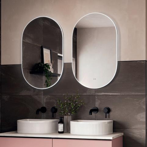 Elevate your bathroom with the Ionic mirror. Its sleek pill-shaped design, LED illumination, and heated pad and touch switch offer style and practicality.