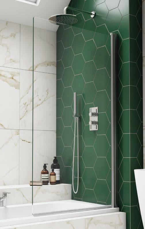 Featuring a 305mm fixed panel that is permanently sealed to the bath and providing absolute showering protection. The larger 645mm panel opens out to allow access to shower controls and cleaning.