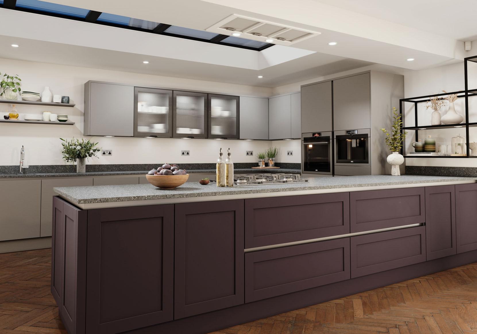 The daring choice of Damson on the peninsular island brings richness to this kitchen, contrasting with Mala Matt Platinum Grey on the main kitchen and anodised aluminium handleless profile rails. We’ve chosen minerva® Nimbus Grey worksurfaces with upstands and accessorised with our box shelving, reeded glass doors and linear shelf supports with shelves to match the Mala doors.