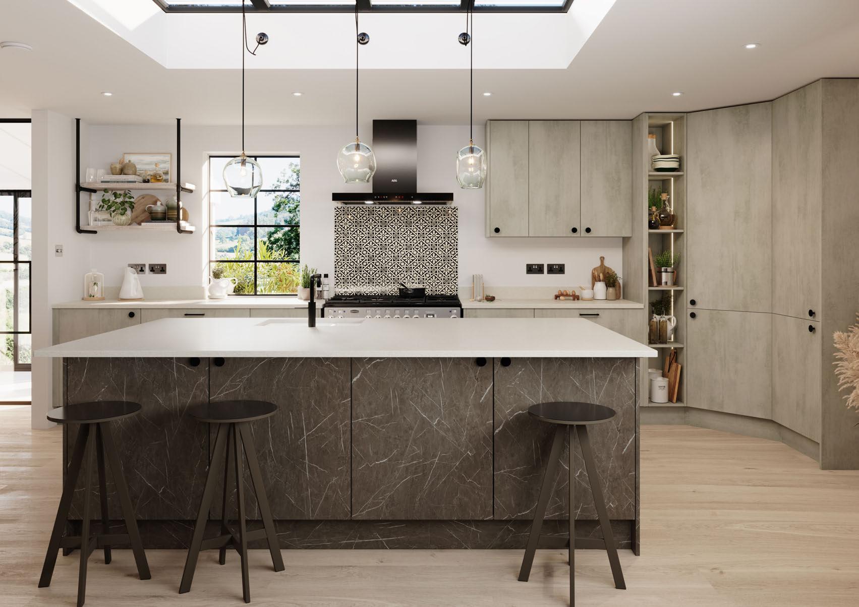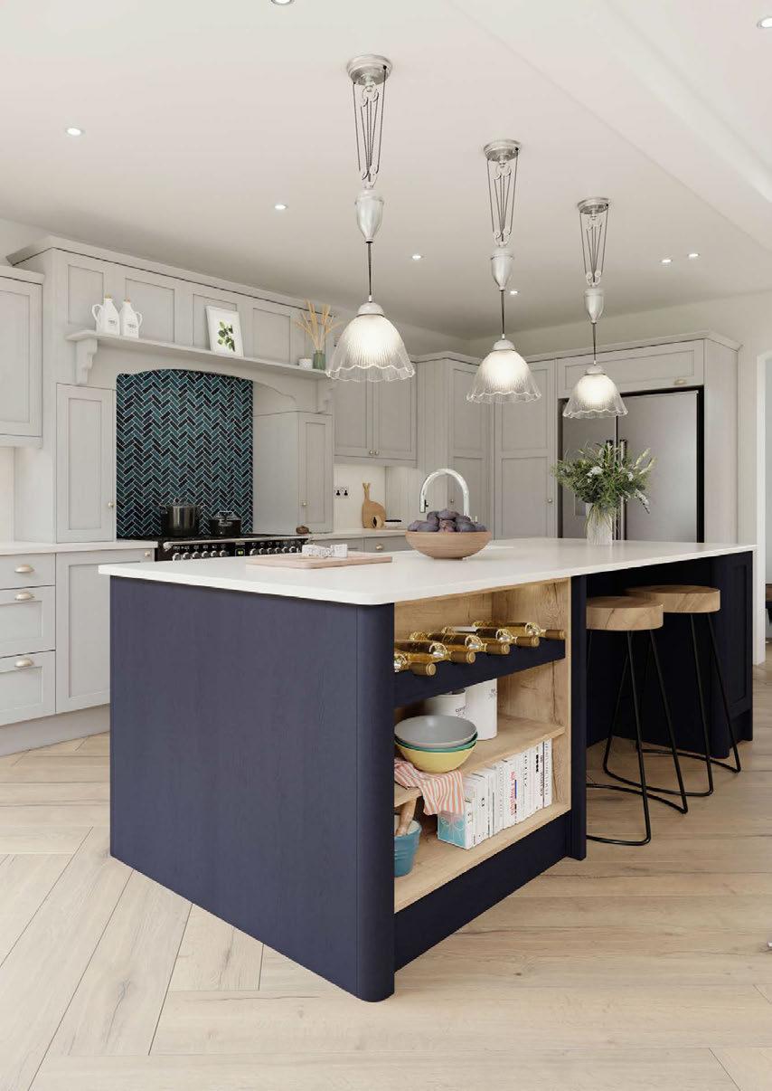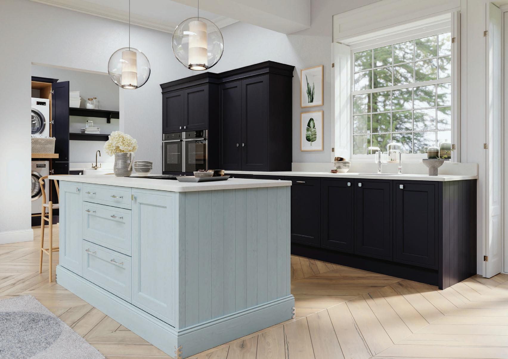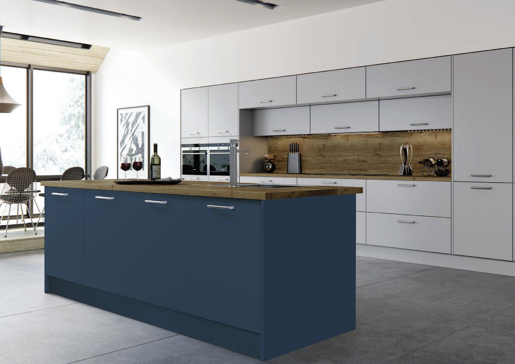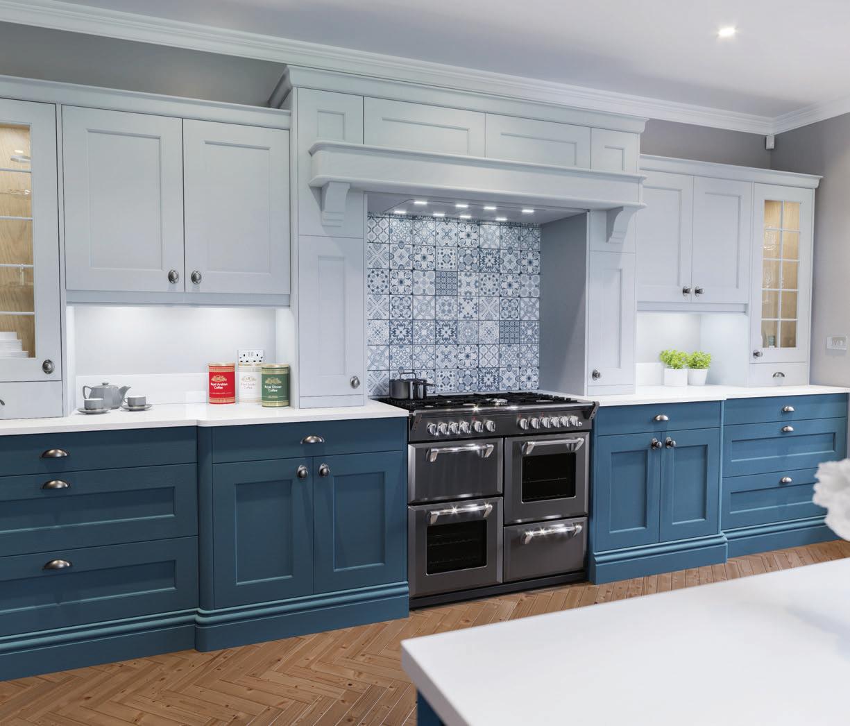 Hutton designed in Indigo and Breeze creates a fresh blend of contemporary colours. The skirting plinth with decorative skiffers on the corners arou nd the island enriches the feel.