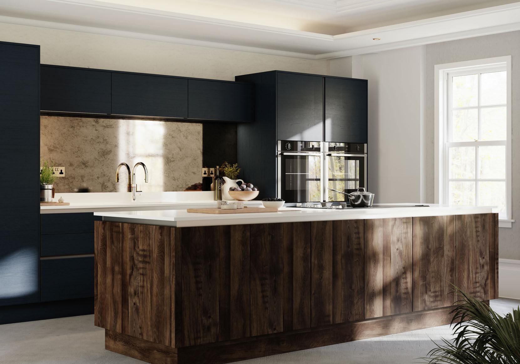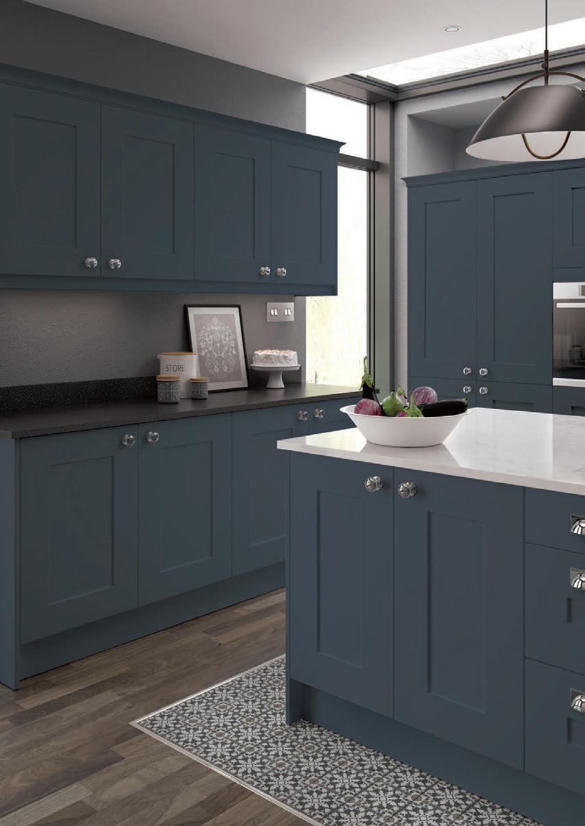 Valina in Midnight exudes quiet opulence with its richly grained dark blue finish. Two-drawer cabinets maintain a refined, uncluttered look, allowing the subtle elegance of the slim shaker frame to take centre stage. This detailing is echoed in the island’s framed end panels, bringing a sense of balance and cohesion to the overall design.