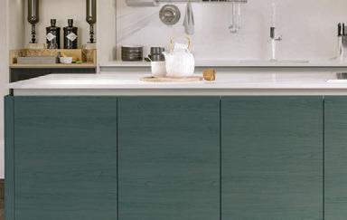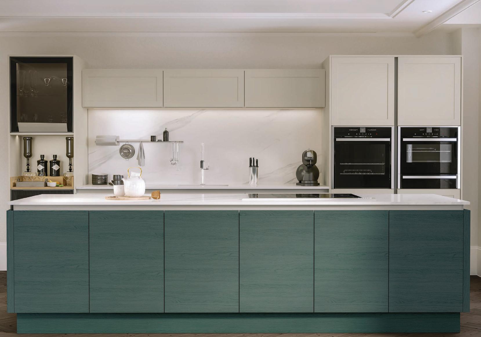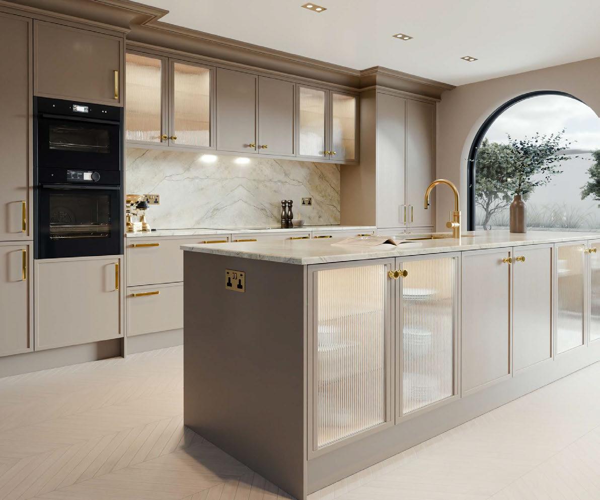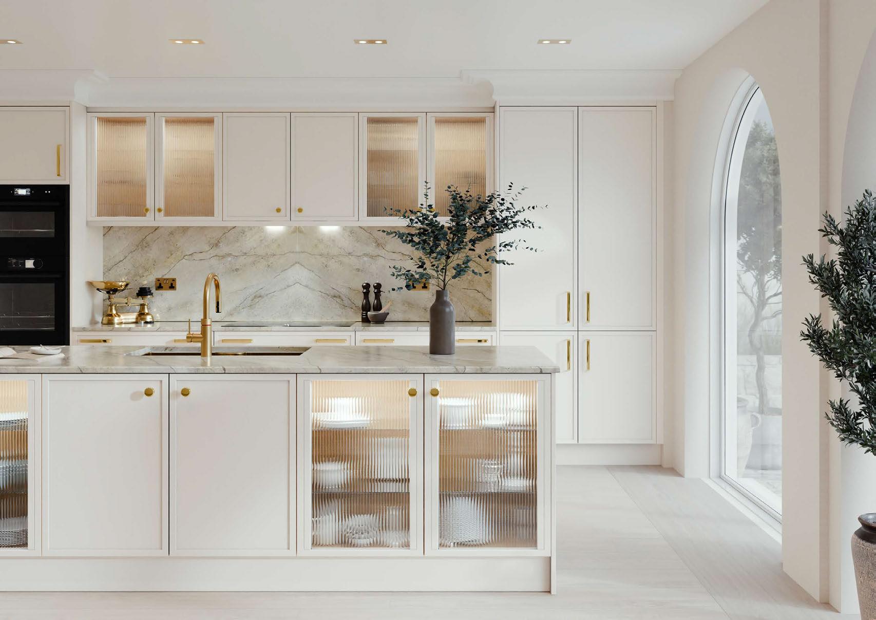 Valina’s refined detailing. Reeded glass doors introduce texture and elegance, while plain panels on the island maintain a clean, pared-back aesthetic for a sense of balance and simplicity.