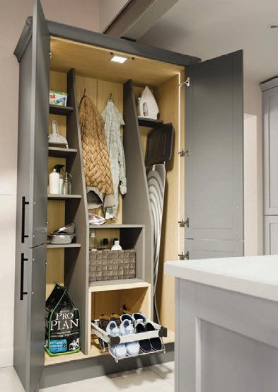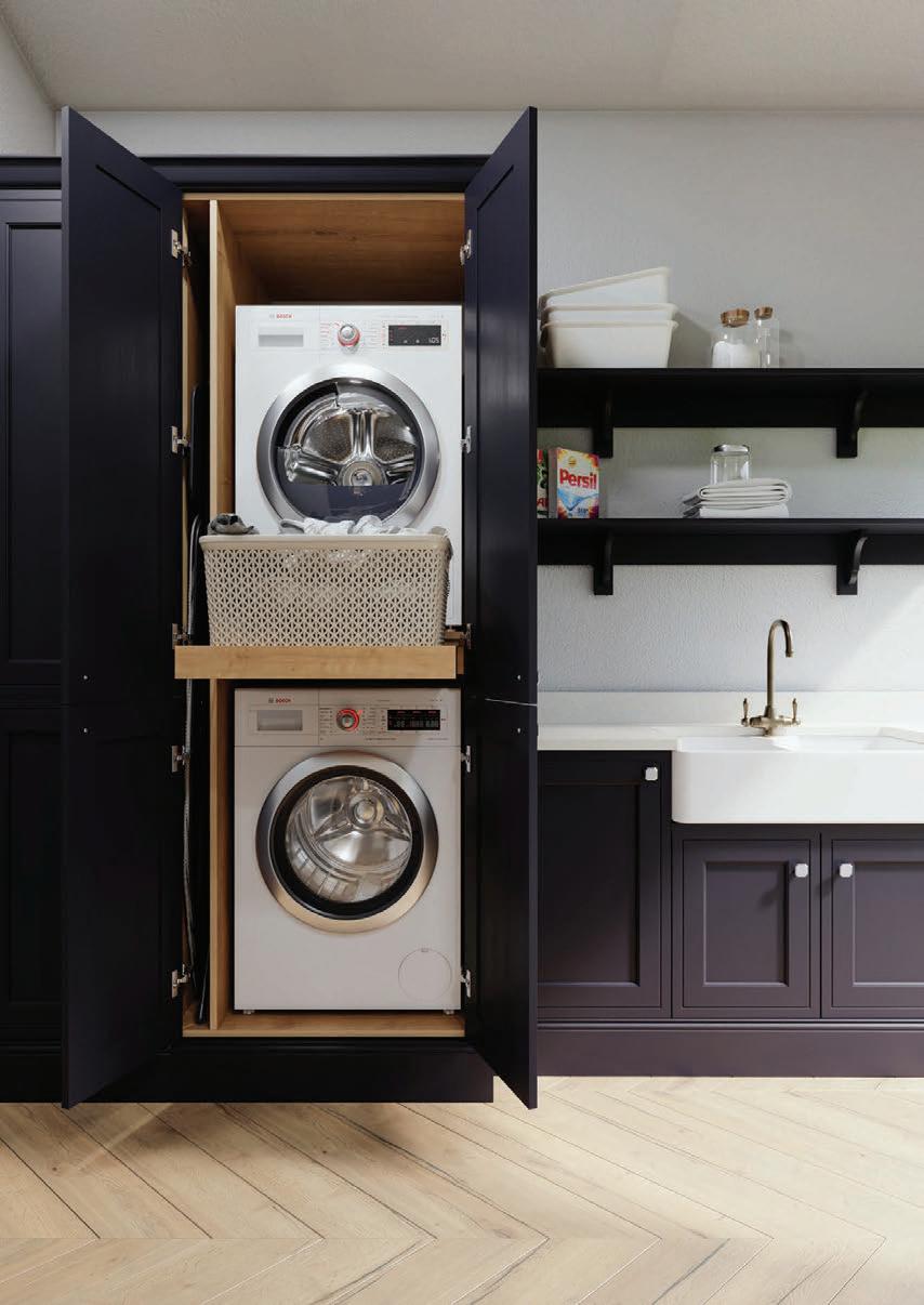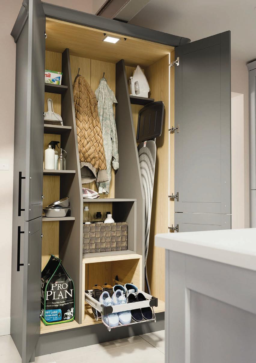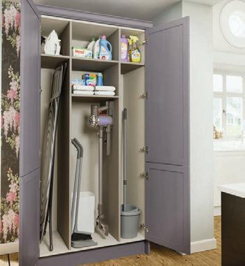 The ideal space to house your larger cleaning and laundry essentials. The shelves at the top are the perfect place to put your detergents and smaller appliances, whilst the tall storage can be used for ironing boards, mops and other taller items. The tall space will accept an ironing board up to 1600mm in height when folded.