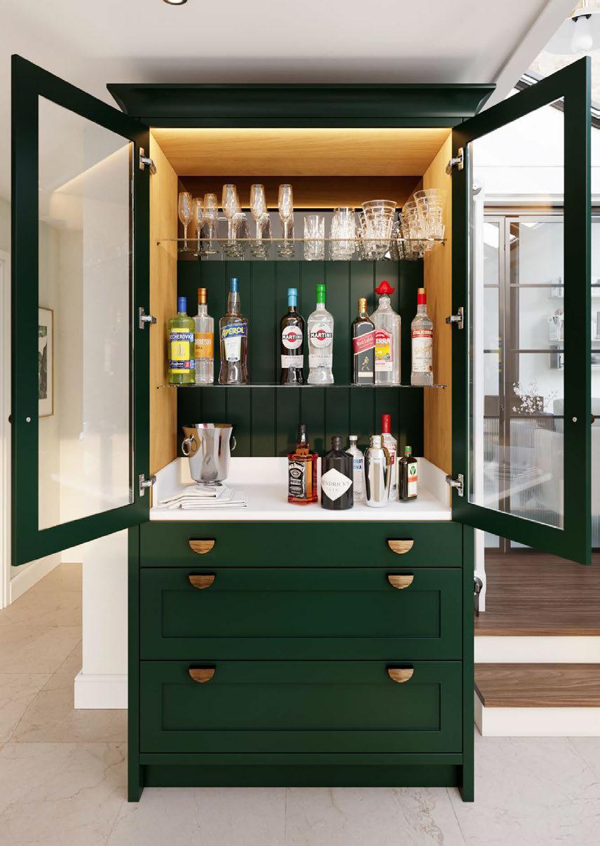 Our Strato door painted in Meadow on the island is a beautiful contrast to the natural hue of the shaker door on the units behind and gives an interesting mix of styles and textures to this kitchen. The gin bar and smoked glass doors are an indulgent modern touch. Strato Meadow