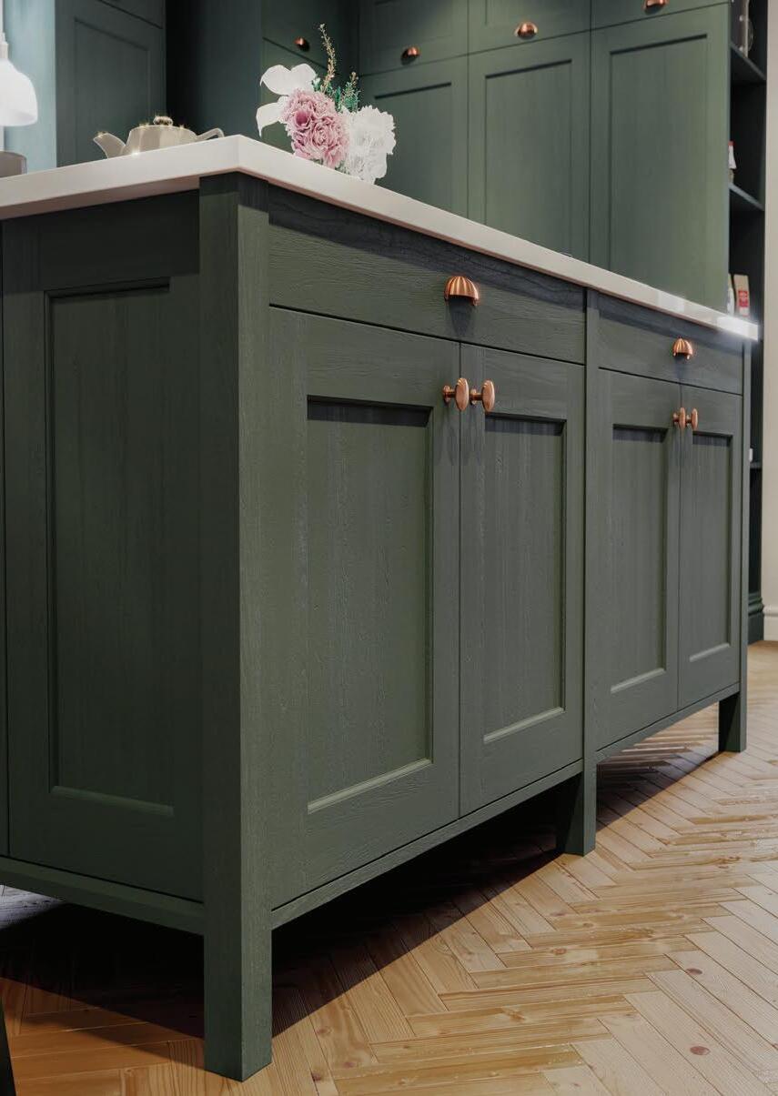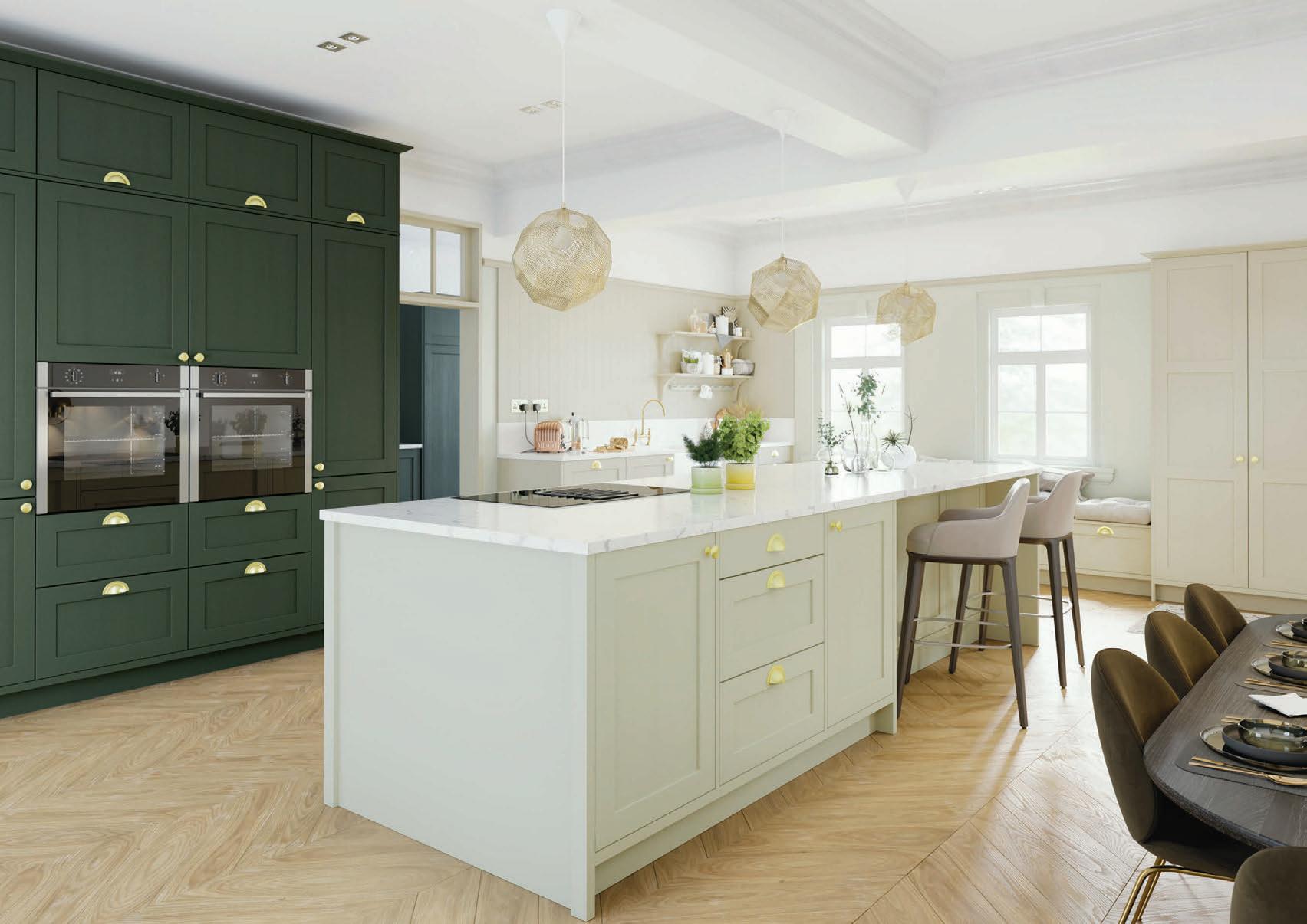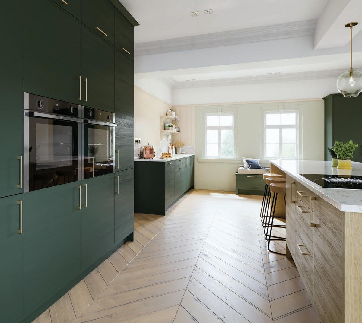 The rich dark green is beautifully complemented by the fresh touch of the natural Pale Oak stain on the island.