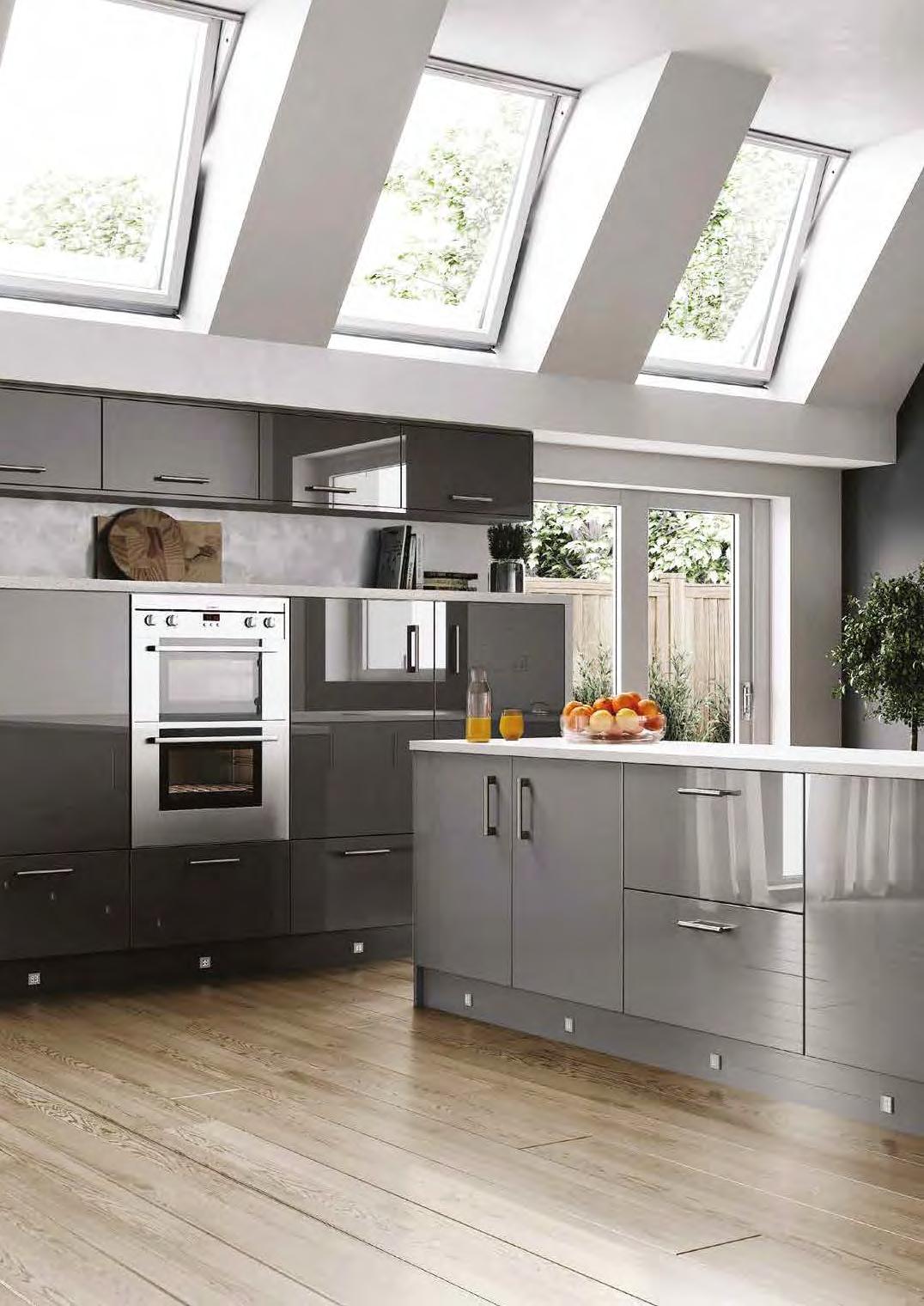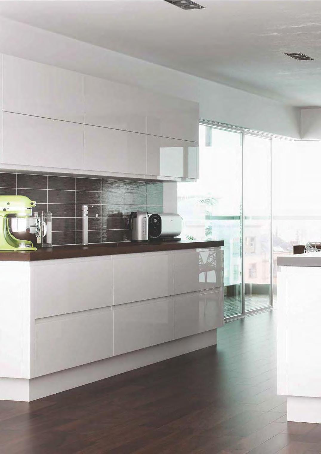 This popular ‘J’ pull handleless range offers contemporary minimalism with a light-reflecting lacquered gloss finish.