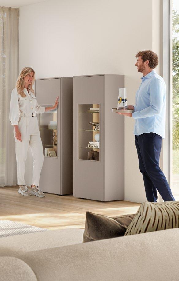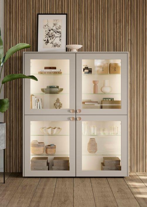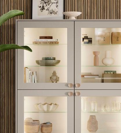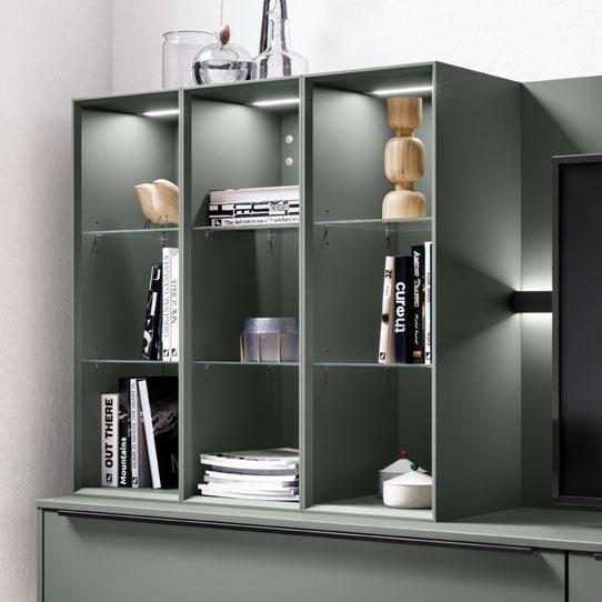 Die Ausleuchtung in Vitrinen und Klappenschränken sorgt für ein stimmiges Ambiente und setzt dekorative Lieblingsstücke in Szene. Besonders harmonisch und perfekt bis ins Detail wirkt das Design, wenn die Akzentrückwand der Vitrine auf das Dekor des Wandpaneels abgestimmt ist.