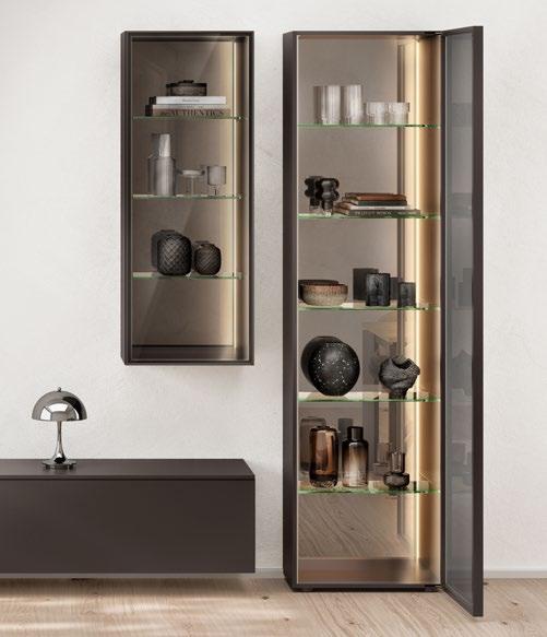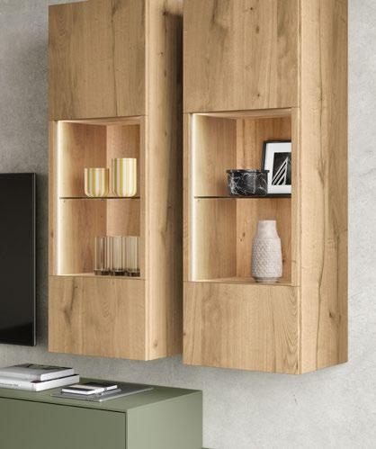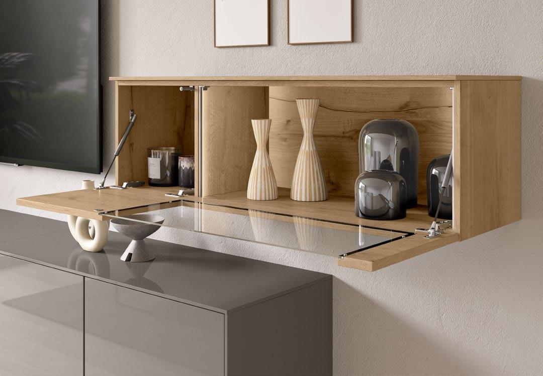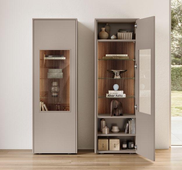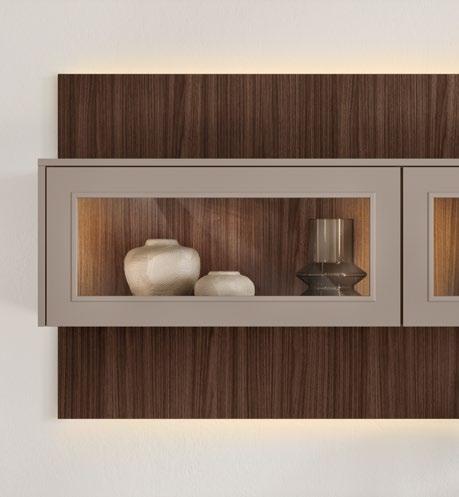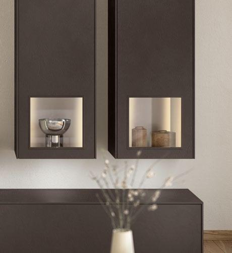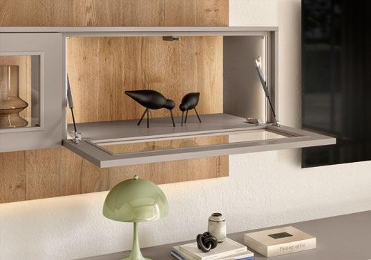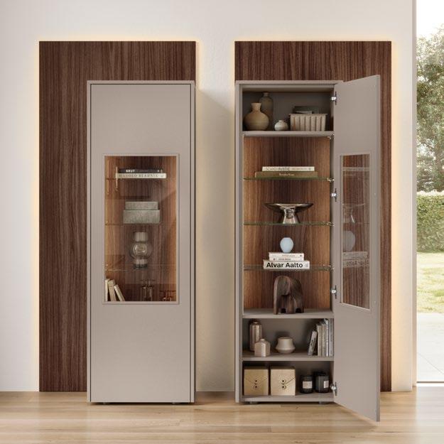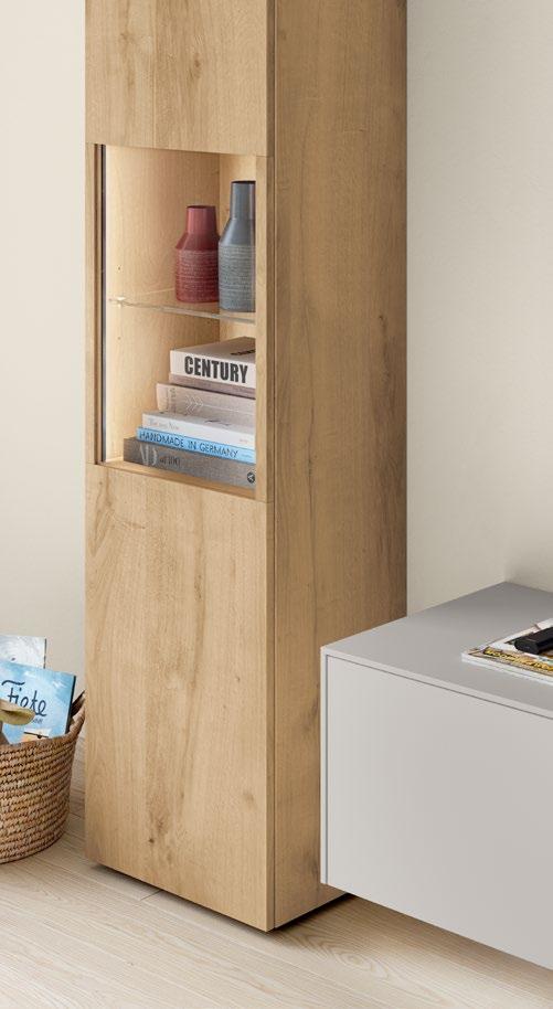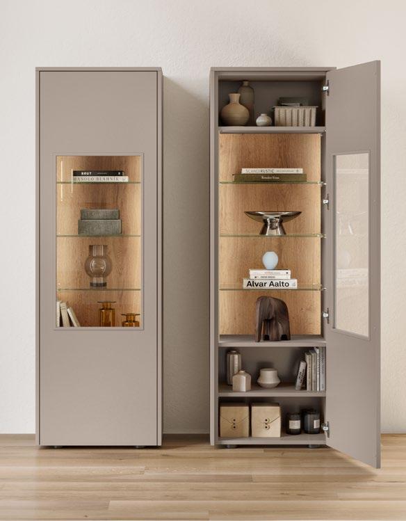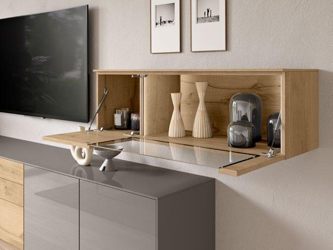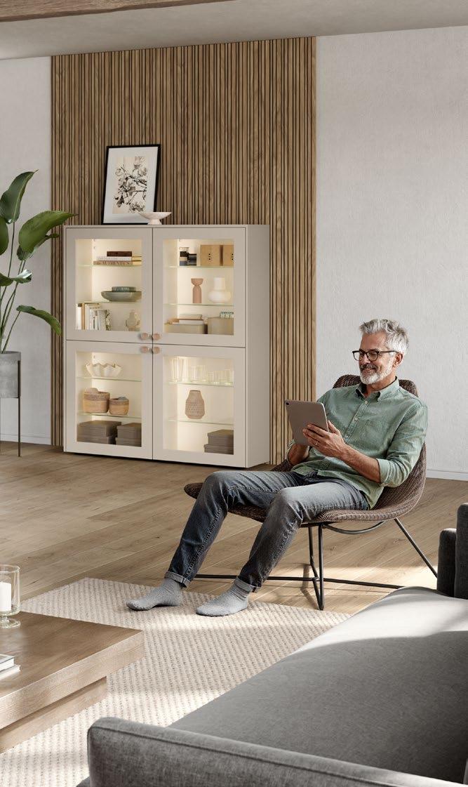 Lights on – atmosphere set: the lighting in the glass cabinets and flap door cabinets creates a harmonious ambience for showcasing your favourite decorative pieces. The design achieves a particular feeling of balance and perfection when the glass cabinet’s eye catcher back panel matches the wall panel’s décor.