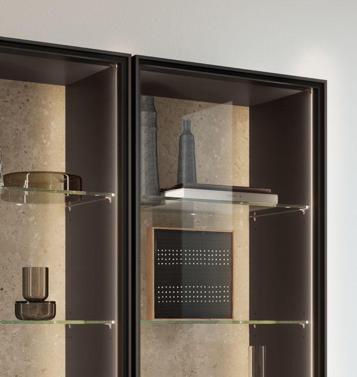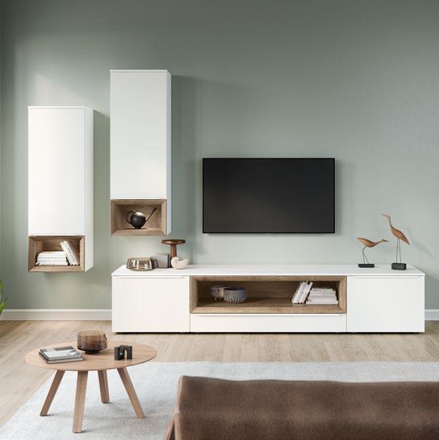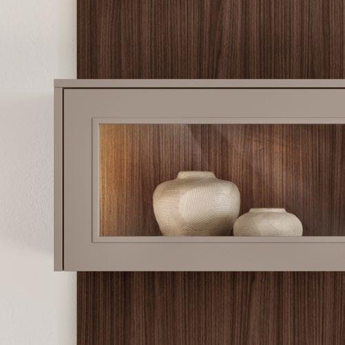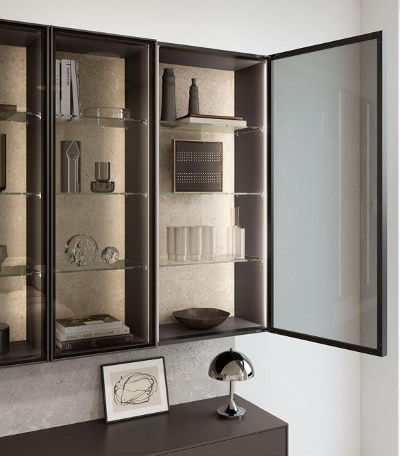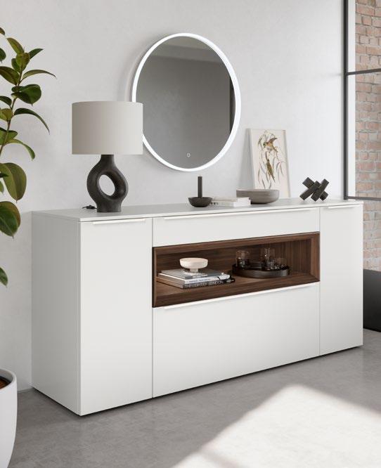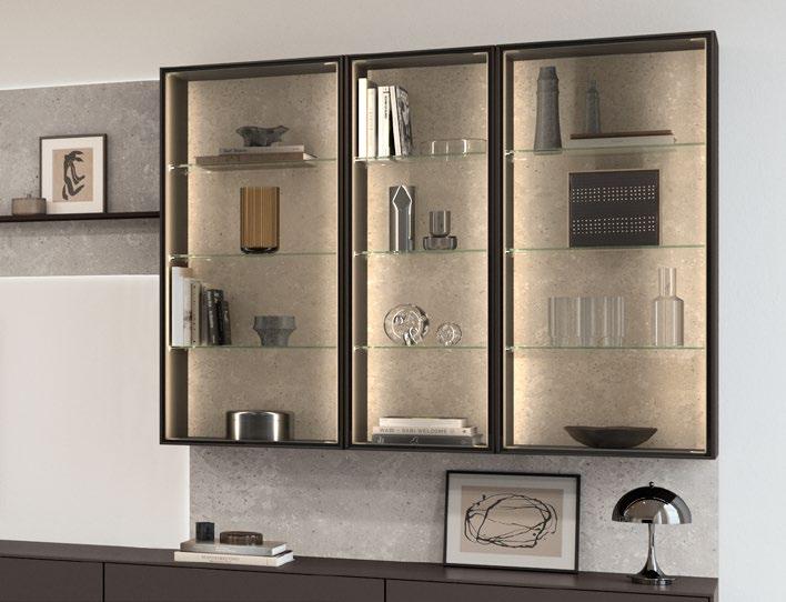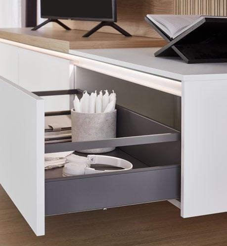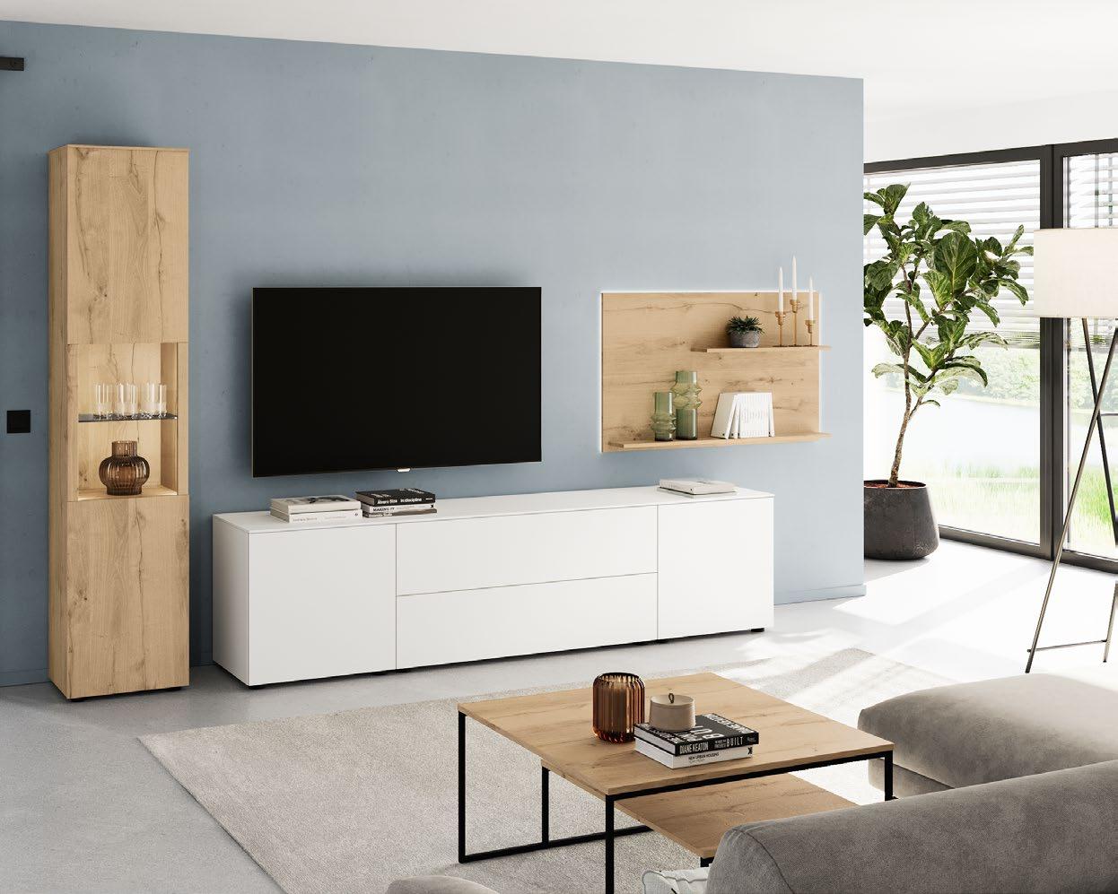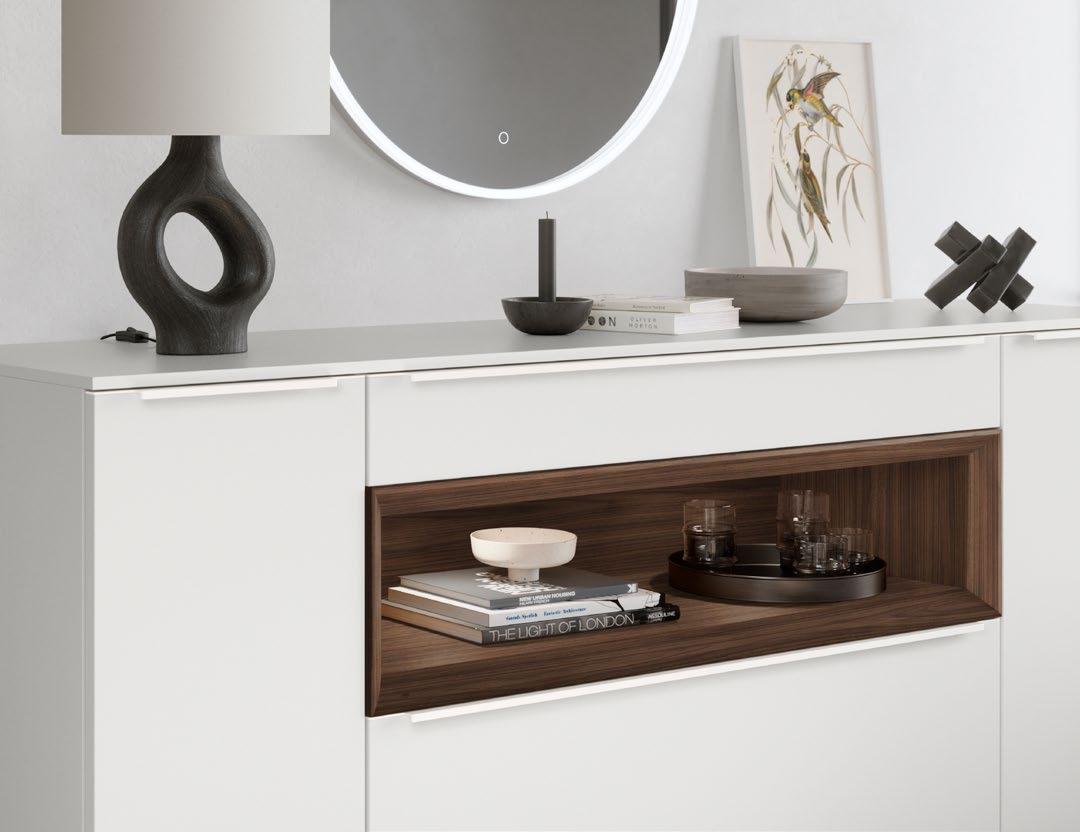 Lights on – atmosphere set: the lighting in the glass cabinets and flap door cabinets creates a harmonious ambience for showcasing your favourite decorative pieces. The design achieves a particular feeling of balance and perfection when the glass cabinet’s eye catcher back panel matches the wall panel’s décor.