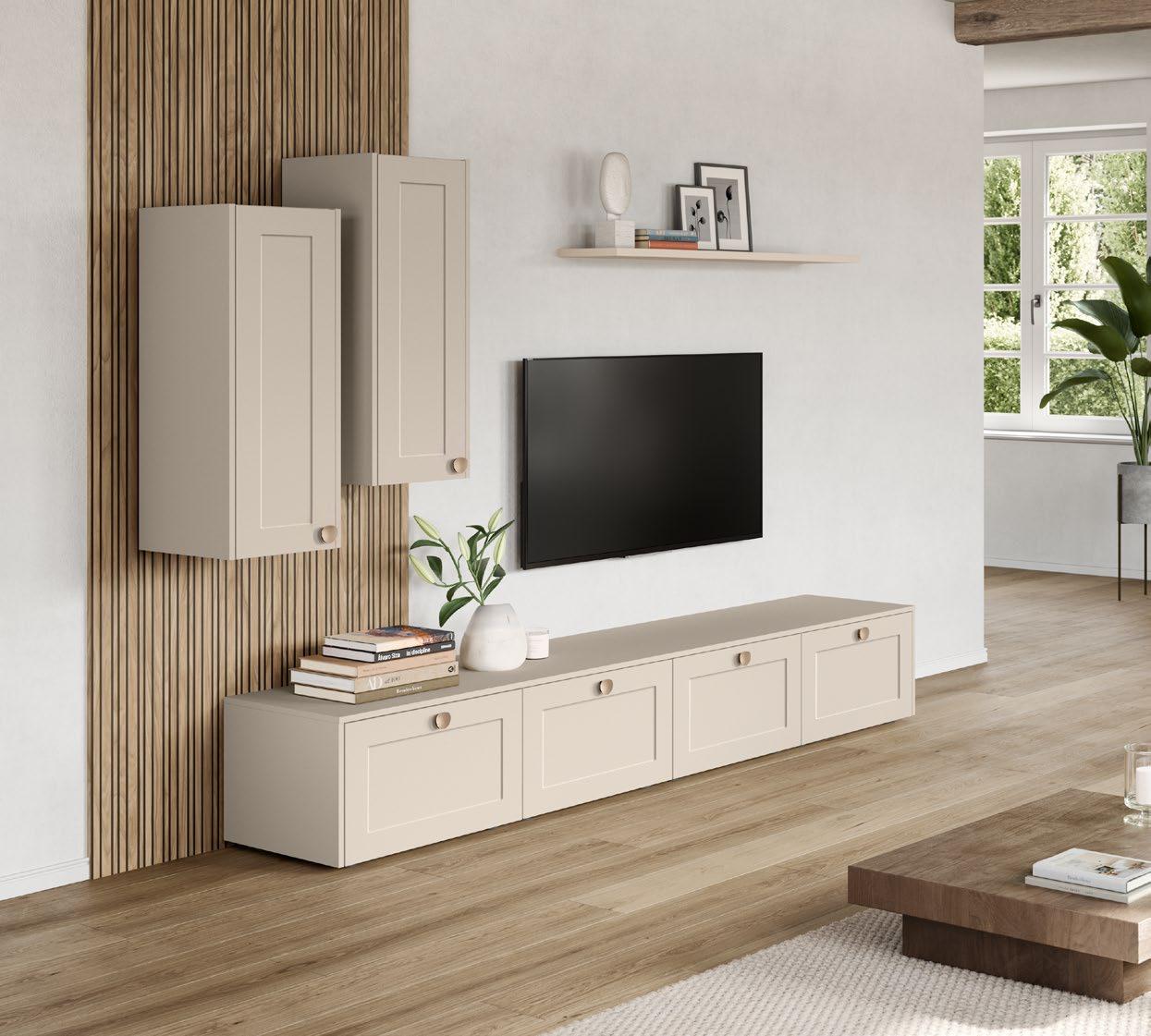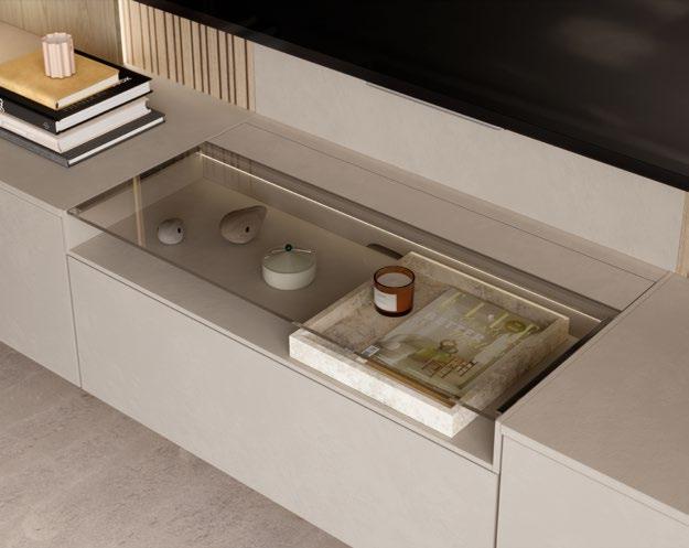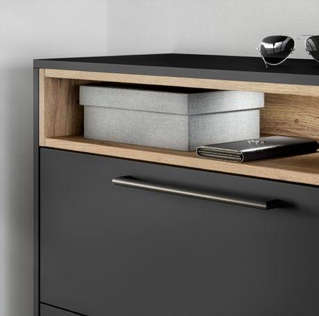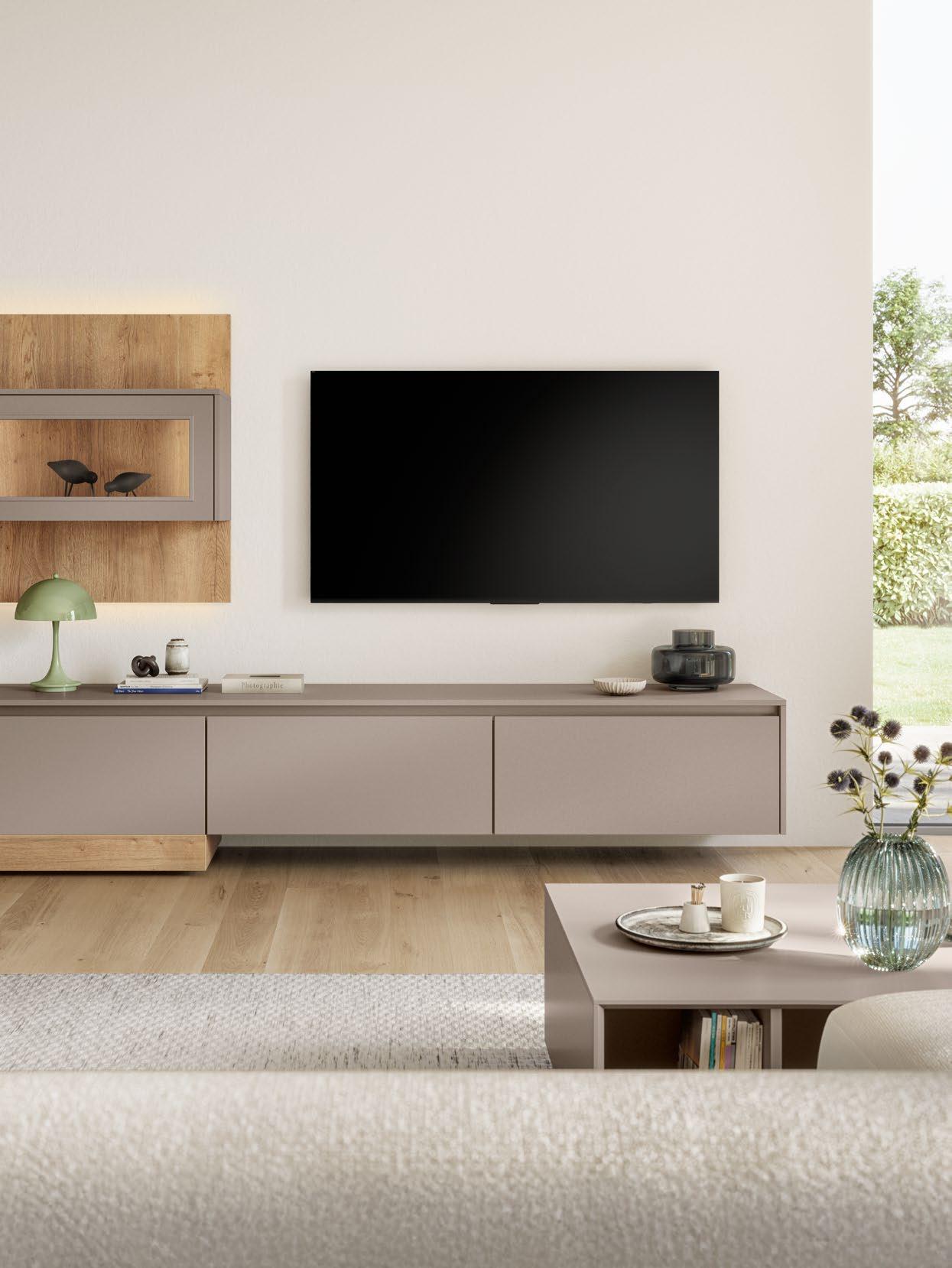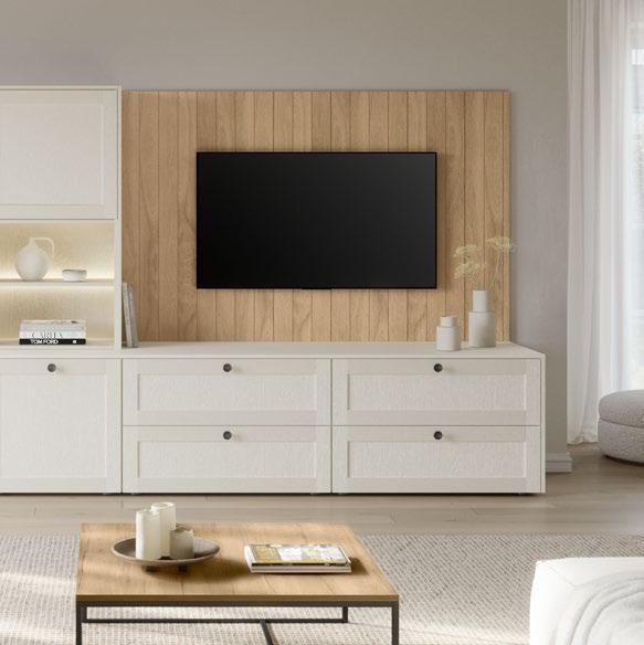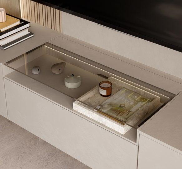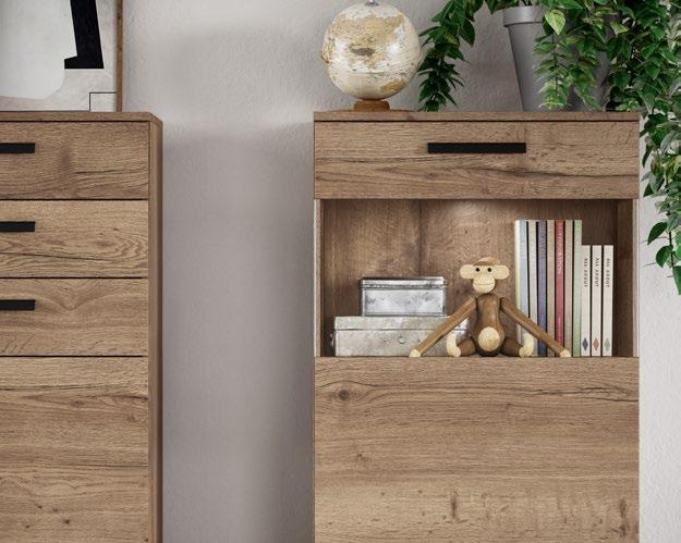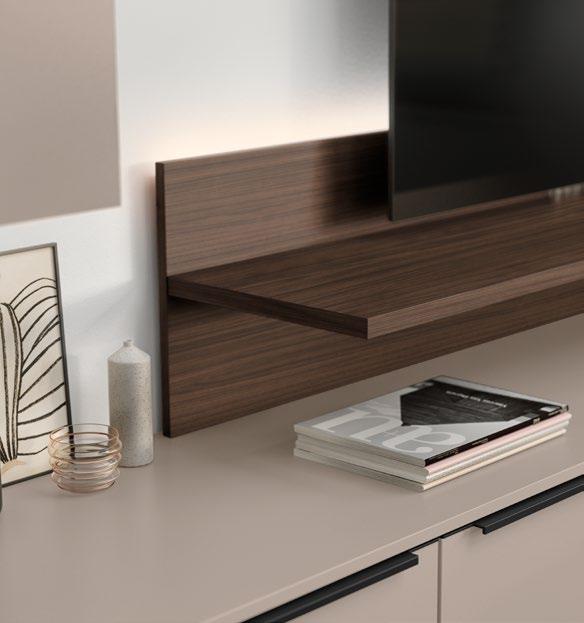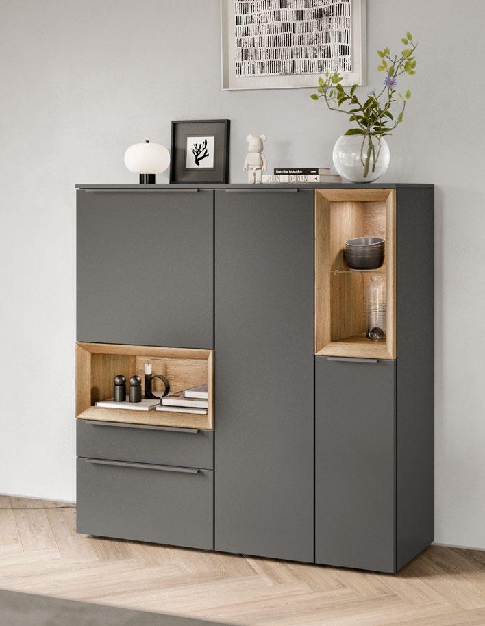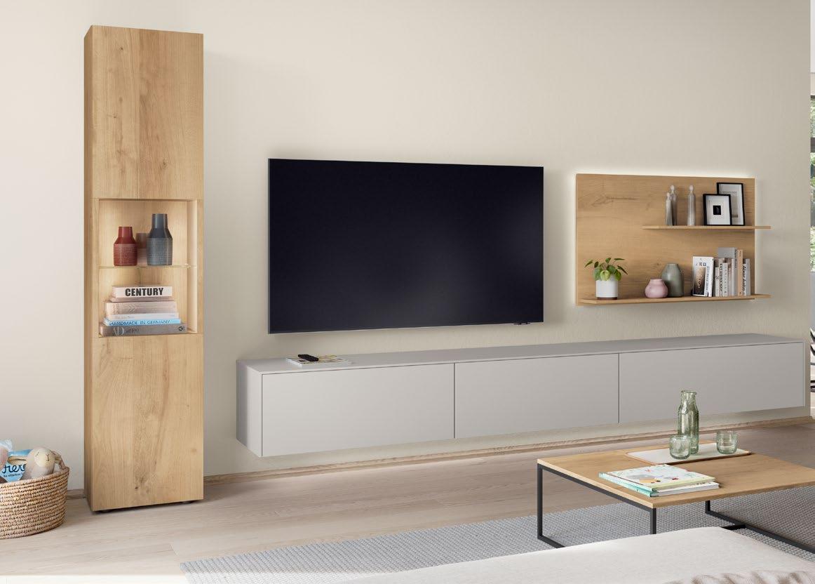 Lights on – atmosphere set: the lighting in the glass cabinets and flap door cabinets creates a harmonious ambience for showcasing your favourite decorative pieces. The design achieves a particular feeling of balance and perfection when the glass cabinet’s eye catcher back panel matches the wall panel’s décor.