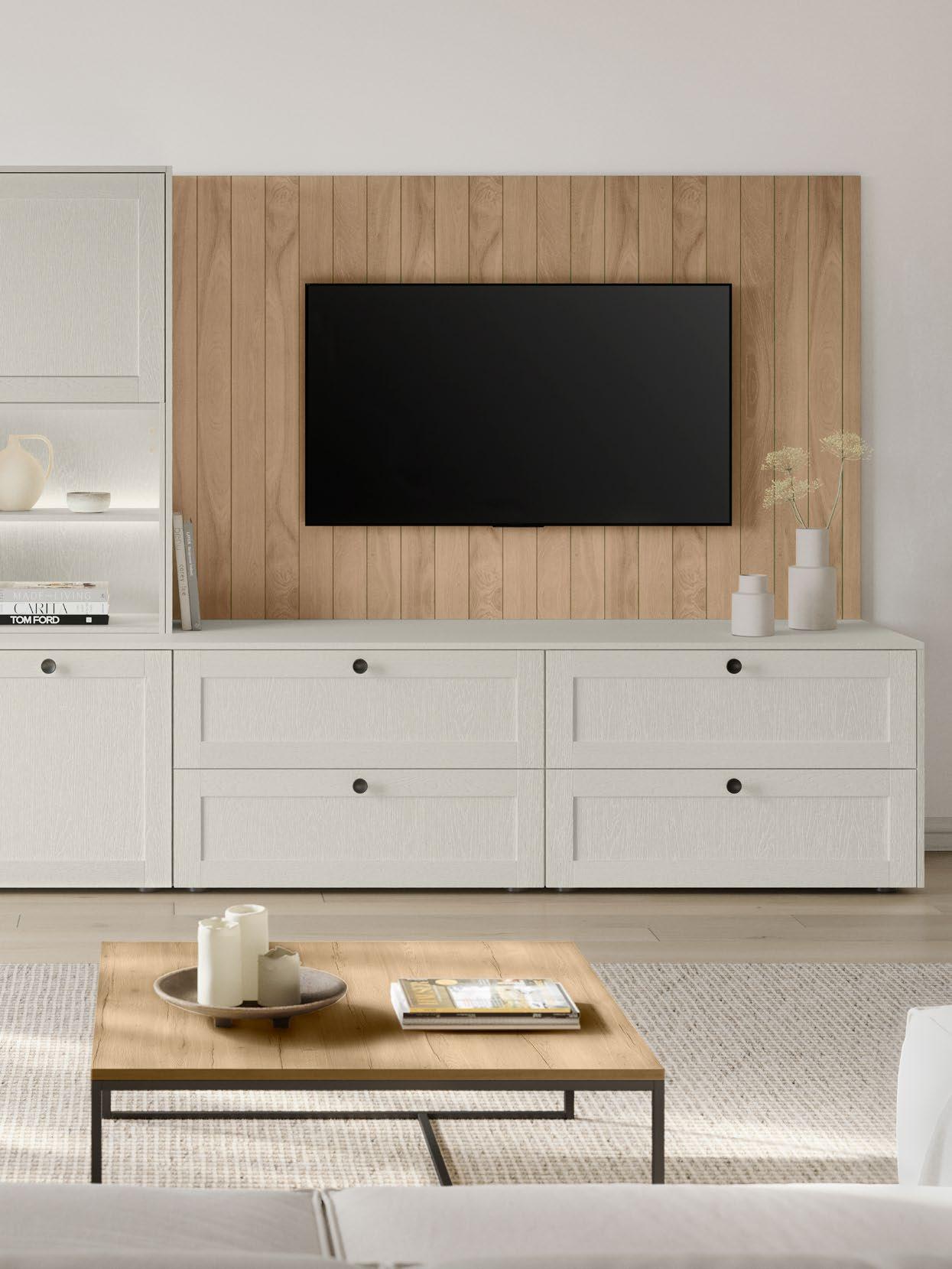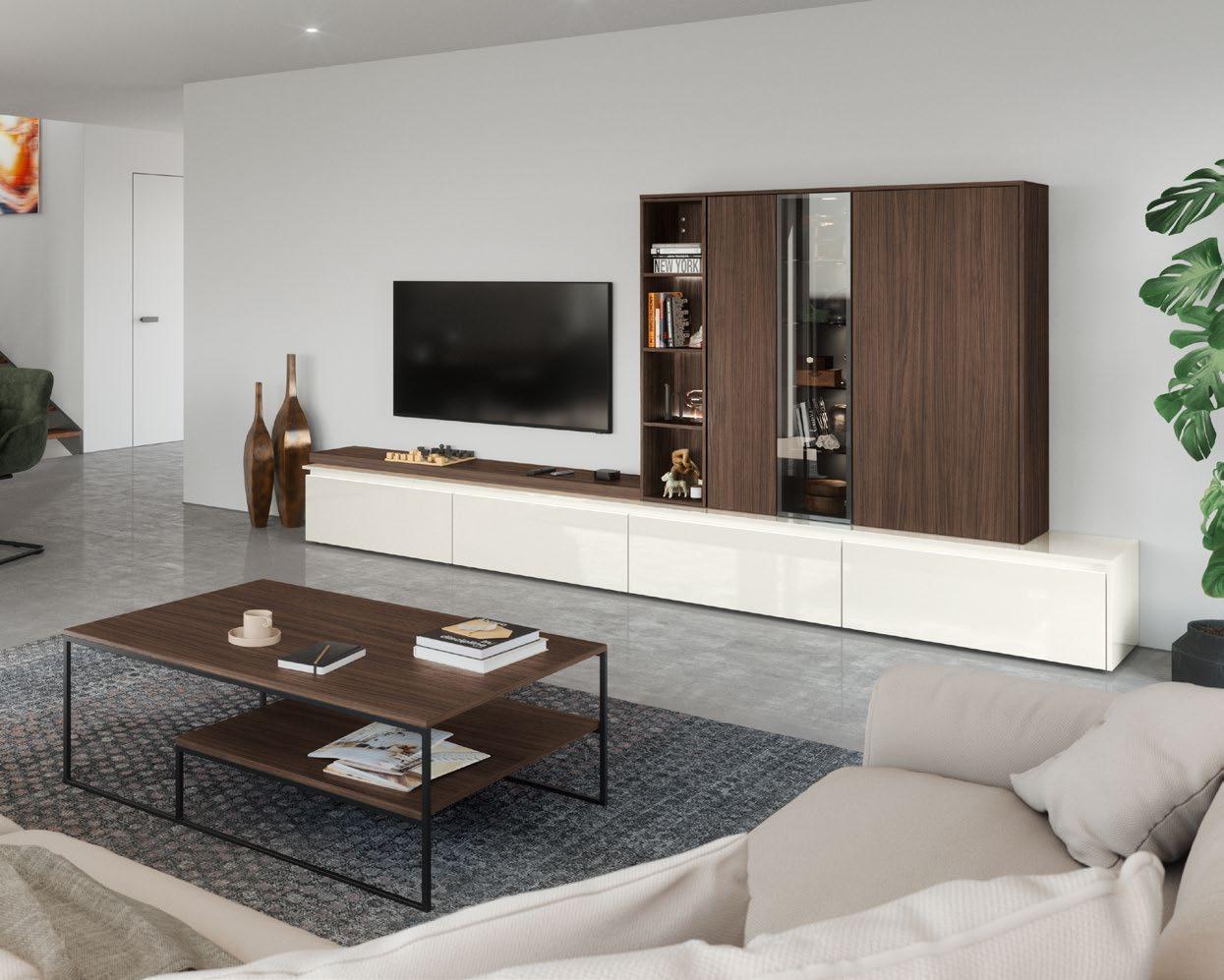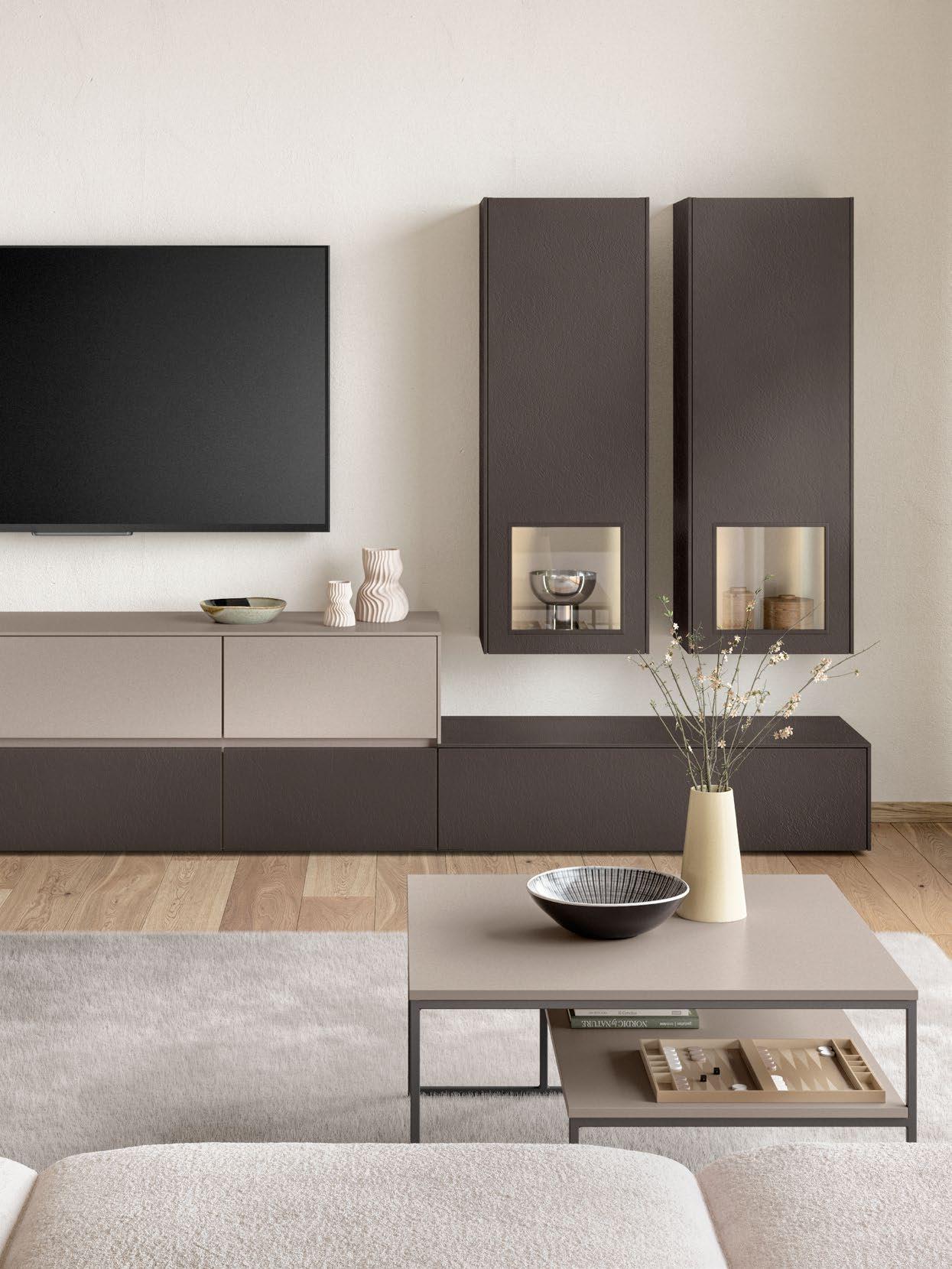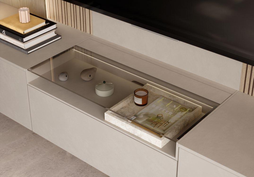 Lights on – atmosphere set: the lighting in the glass cabinets and flap door cabinets creates a harmonious ambience for showcasing your favourite decorative pieces. The design achieves a particular feeling of balance and perfection when the glass cabinet’s eye catcher back panel matches the wall panel’s décor.