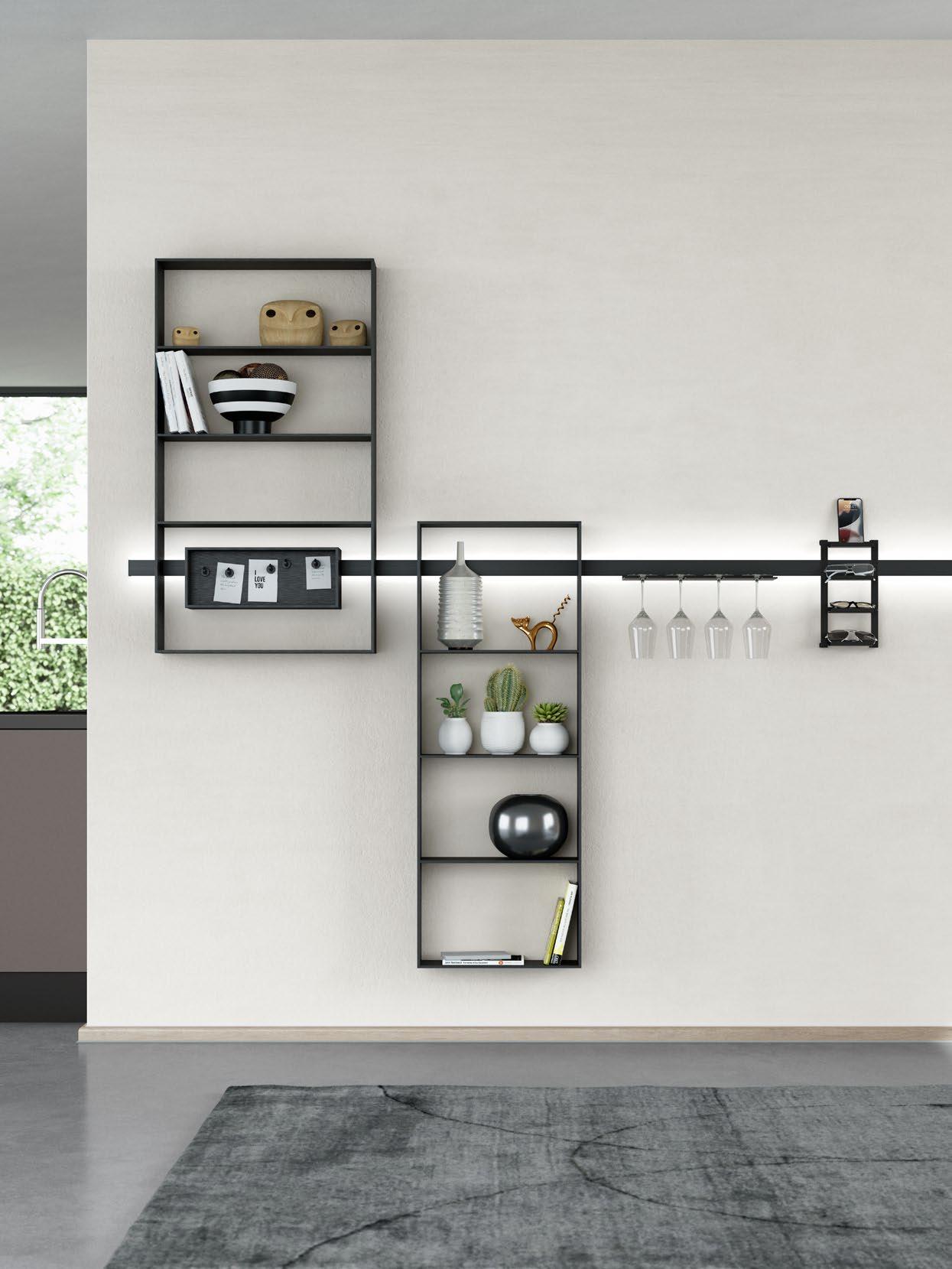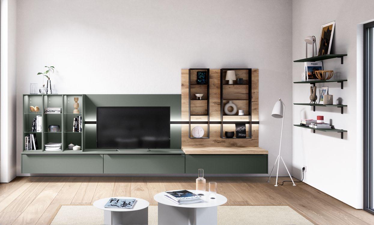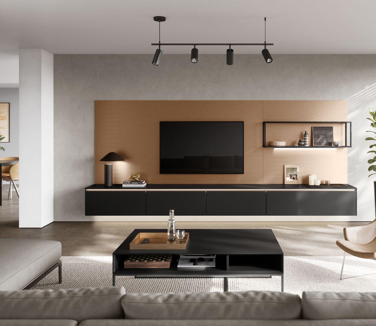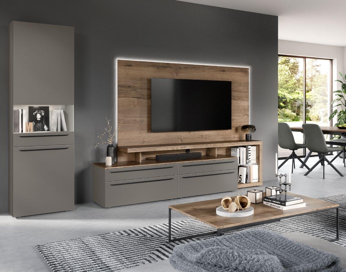 Das Leben zu Hause kreativer gestalten! Das Zusammenspiel aus geschlossenen und offenen Elementen wirkt ausgesprochen ästhetisch, besonders durch das elegante Lowboard in der Trendfarbe Koralle. Vielseitig und offen für Dekoratives: ein großzügig geplantes Regalsystem aus schwarzem Stahl mit integrierter Beleuchtung für außergewöhnliche Lichteffekte.