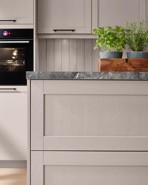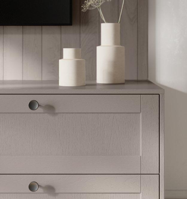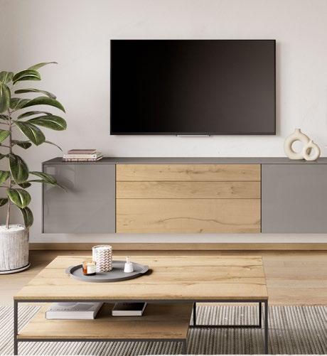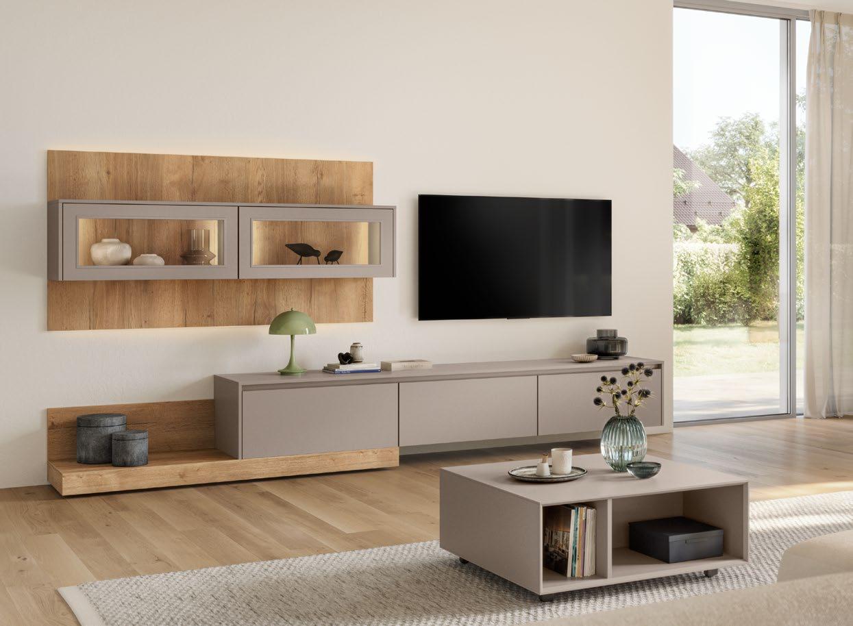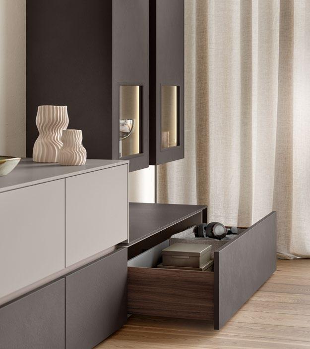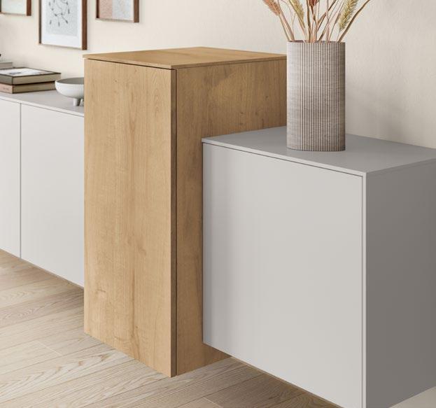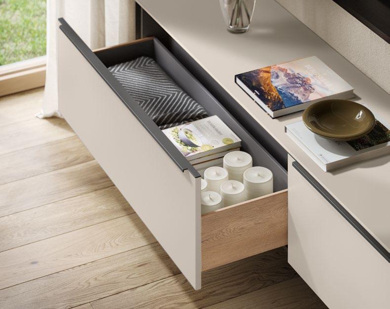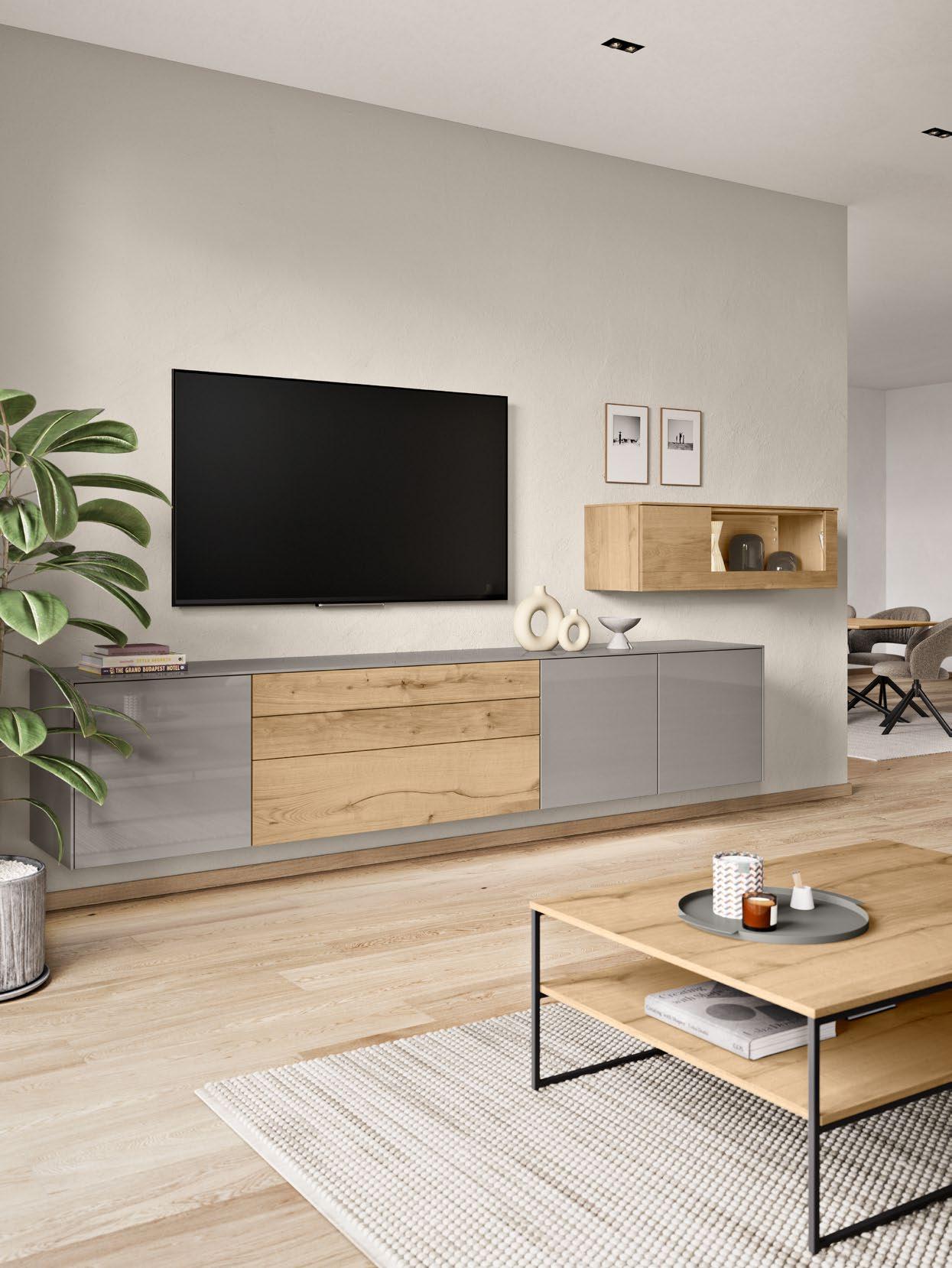High-gloss lacquer fronts in warm taupe grey meet bold Native Oak genuine wood veneer, combining natural feel and modern elegance in an effective way. The fine grain of the genuine wood adds a touch of authenticity and depth while highlighting the design’s character.