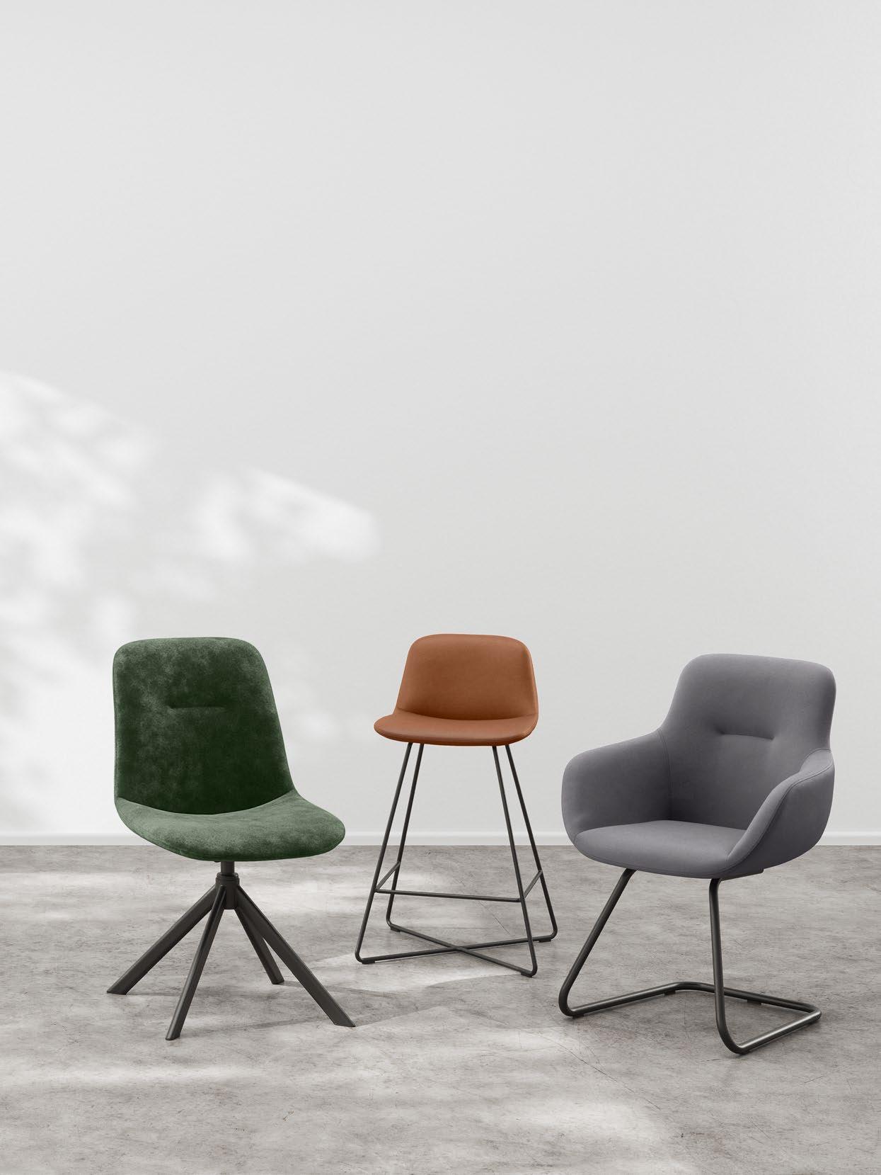 Chairs with a steel frame unite comfort and design – Cross is versatile and a genuine eye-catcher. Available as an upholstered chair, upholstered armchair, tall stool and bar stool.
