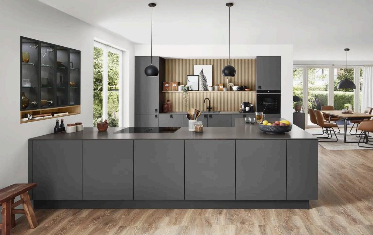 Dark matt kitchens in greys and blacks are on-trend, offering sleek sophistication or layered depth when paired with natural elements like wood, stone, or glass. Warm accents in marble, taupe, or metallics balancethelookwithwelcomingappeal.