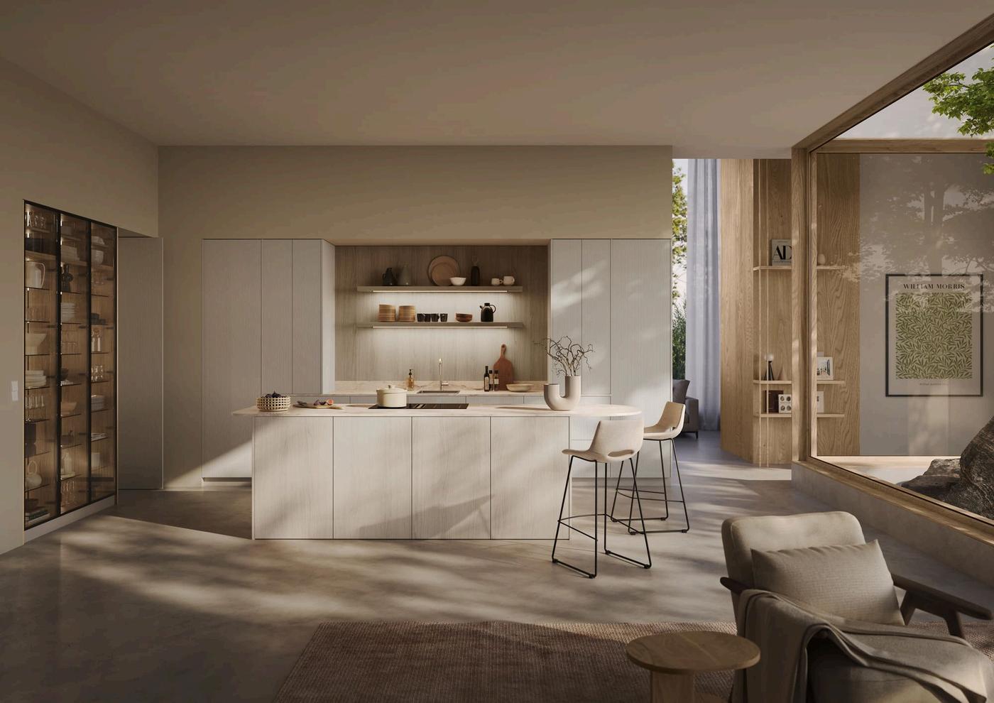 Pastel shades bring lightness and versatility to kitchen design. Their neutrality pairs beautifully with materials like wood, stone, and ceramics, makingshadematchingeasy.Whileoftenlinkedto classic Shaker or country styles, pastels can also create modern, flexible designs with timeless appeal