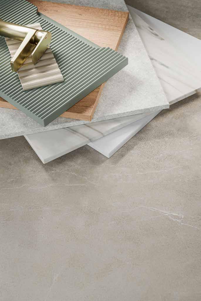 A classic Cameo White background is imbued with the quiet luxury of beige and grey veins for a reserved, timeless look.