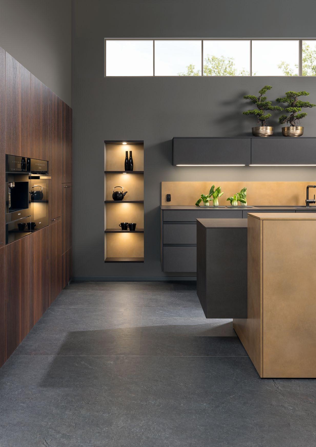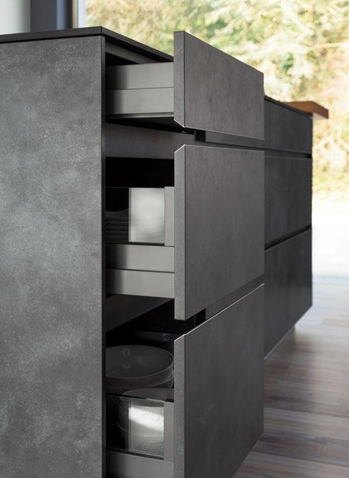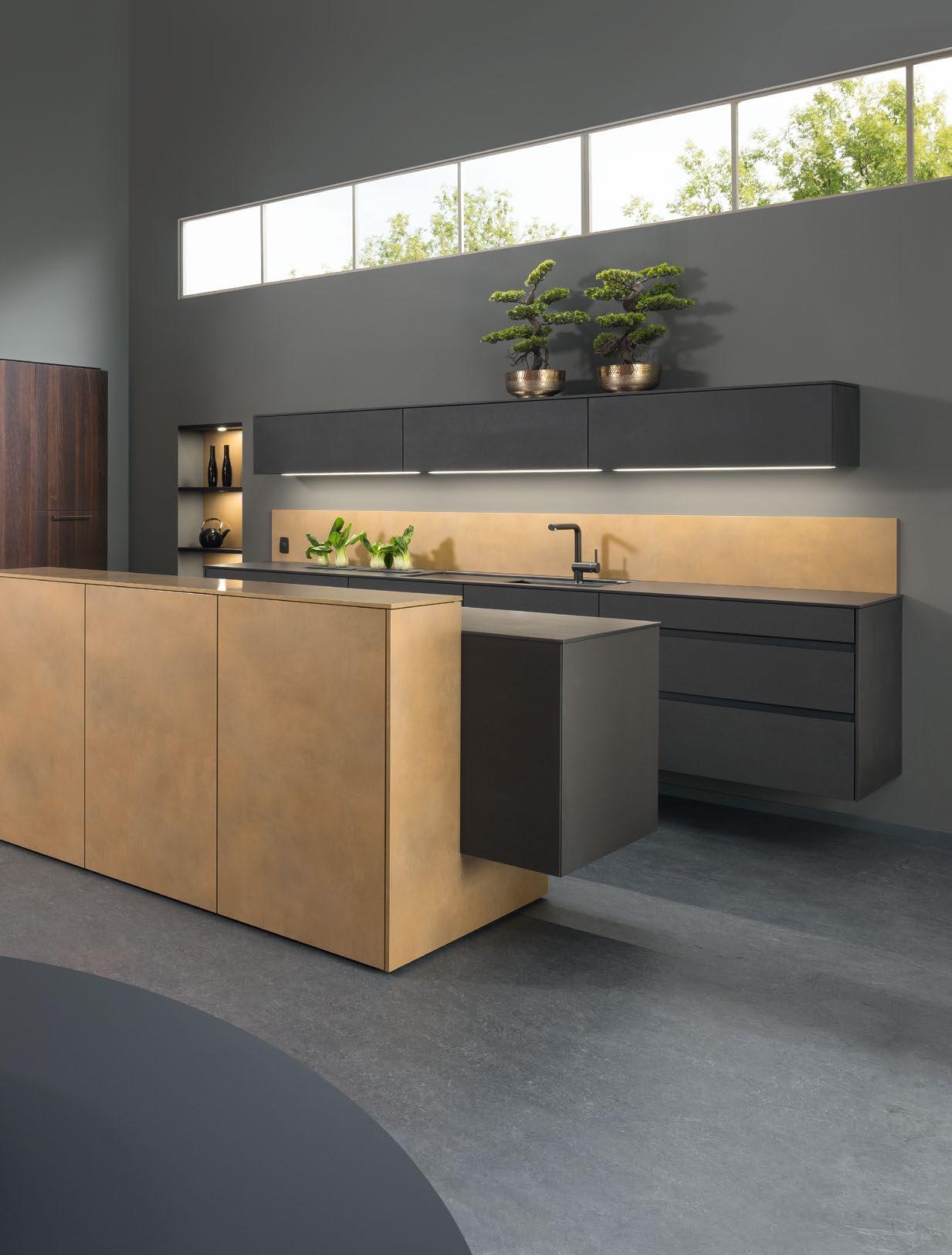 Küche ist mehr als die Begeisterung fürs Kochen. Sie ist beliebter Dreh- und Angelpunkt der Familie oder des ganzen Freundeskreises. Sie expandiert in alle Lebensbereiche hinein. Angenehme Haptik und hervorragende Reinigungsund Pflegeeigenschaften sorgen für grenzenloses Kochvergnügen. Die schwarze, mineralische Steinoptik-Oberfläche zaubert einen Hauch von Luxus in die Küche, die Farbe Bronze sorgt für den notwendigen Glamour. Fronten und Wangen wurden auf Gehrung verarbeitet, die schwarz pulverbeschichtete Griffleiste sowie die Arbeitsplatte in Keramik fügen sich harmonisch in das Gesamtbild ein. Unterschiedliche Wangenstärken bieten Gestaltern beliebige Planungs- und Kombinationsmöglichkeiten.