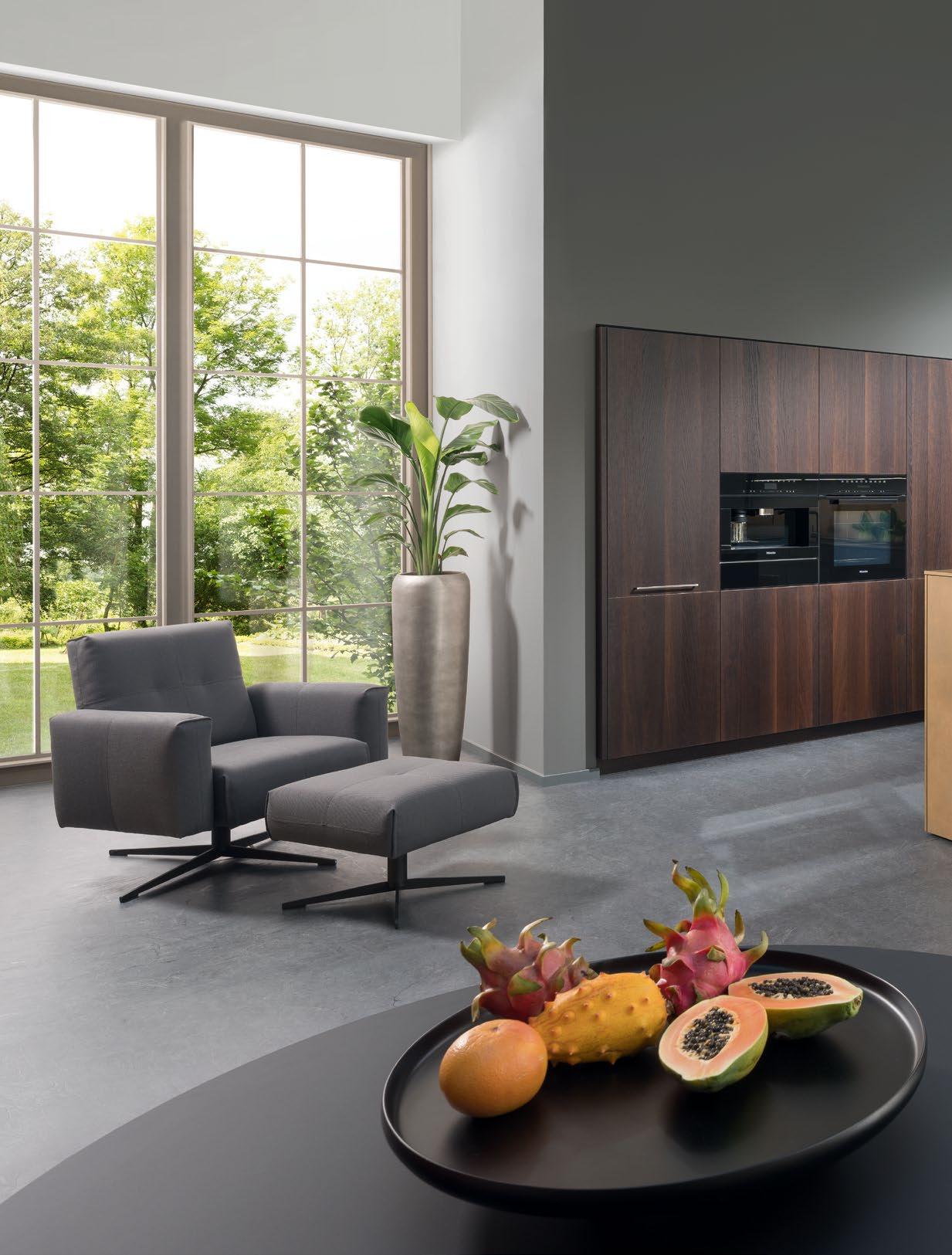 Ausdrucksstarke Oberflächen werden mit einem beruhigenden Farbton in diamant-graphit kombiniert. Passend dazu kann der Korpus auch innen in diamantgraphit ausgewählt werden. Die Hochschränke bieten Stauraum bis zur Decke und sind – ganz nebenbei –auch noch Durchgang zur Speisekammer. Besondere Ecklösungen im Inselbereich lassen Kleinigkeiten im Handumdrehen verschwinden und machen den vorhandenen Platz sinnvoll nutzbar. Zeigen was und wie es gefällt – Schiebetüren vor offenen Nischen gewähren immer wieder eine andere Perspektive auf Lieblingsstücke.
