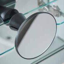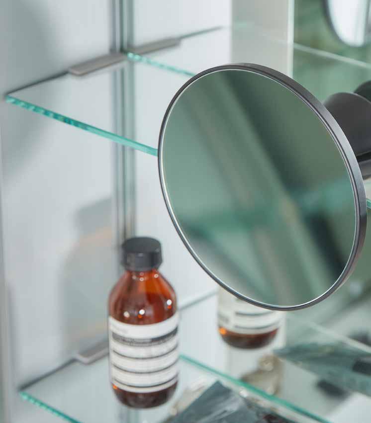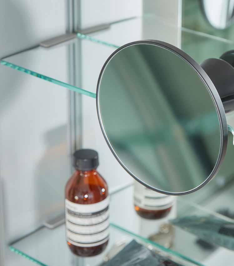 Novella cabinet is supplied with a handheld vanity mirror with 5x magnification. The mirror can be used handheld, clipped to shelf or freestanding.