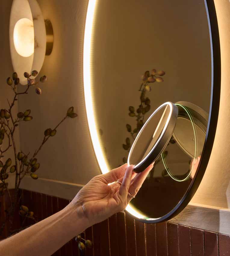 When off, the mirror is sleek and seamless; with a touch, its edges softly illuminate with a halo effect