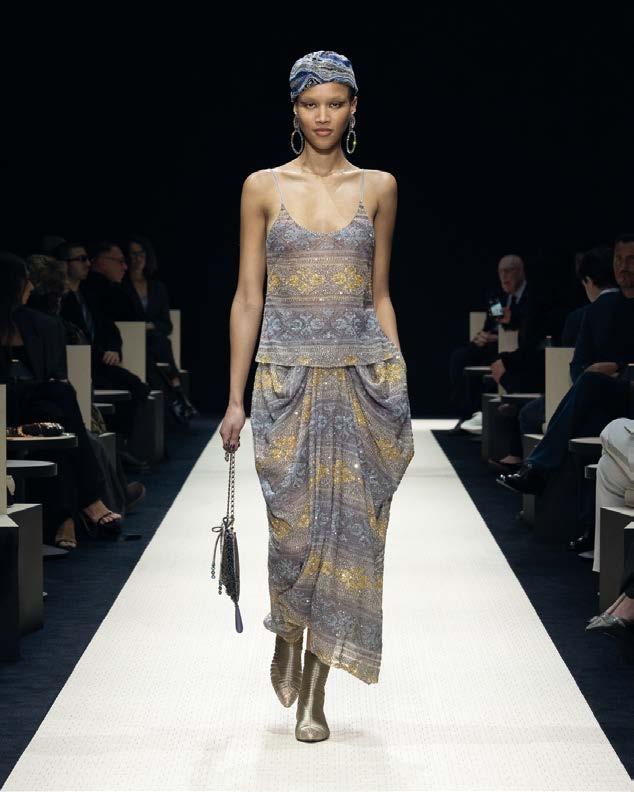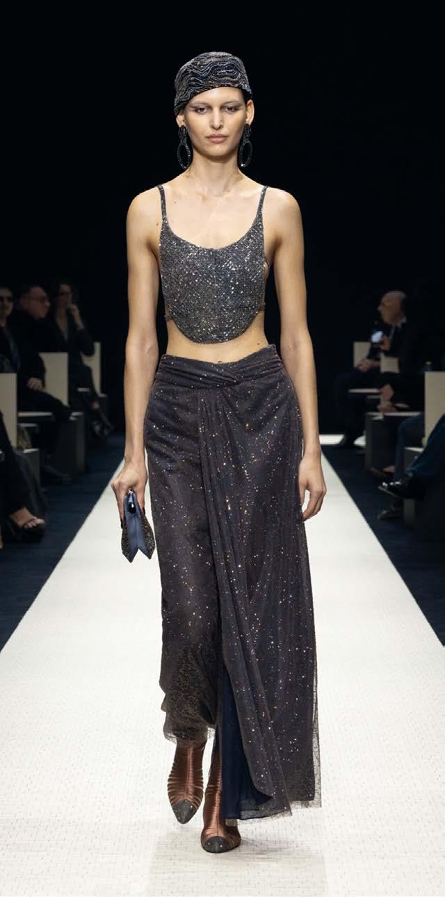 The garments take on his signature volcanic hues and mineral sheens: sandy and golden beige tones, deep browns fading into green, quartz-blue highlights, and every shade of grey. Fabrics are soft yet substantial to the touch velvet, cashmere, jacquard silks. Silk trouser suits flow with ease, coats are deconstructed, jackets carry an impeccable poise. For evening, intricate embroidery adorns fluid dresses. Soft handbags and flat shoes, designed for light yet assured steps, convey an innate sense of confidence.