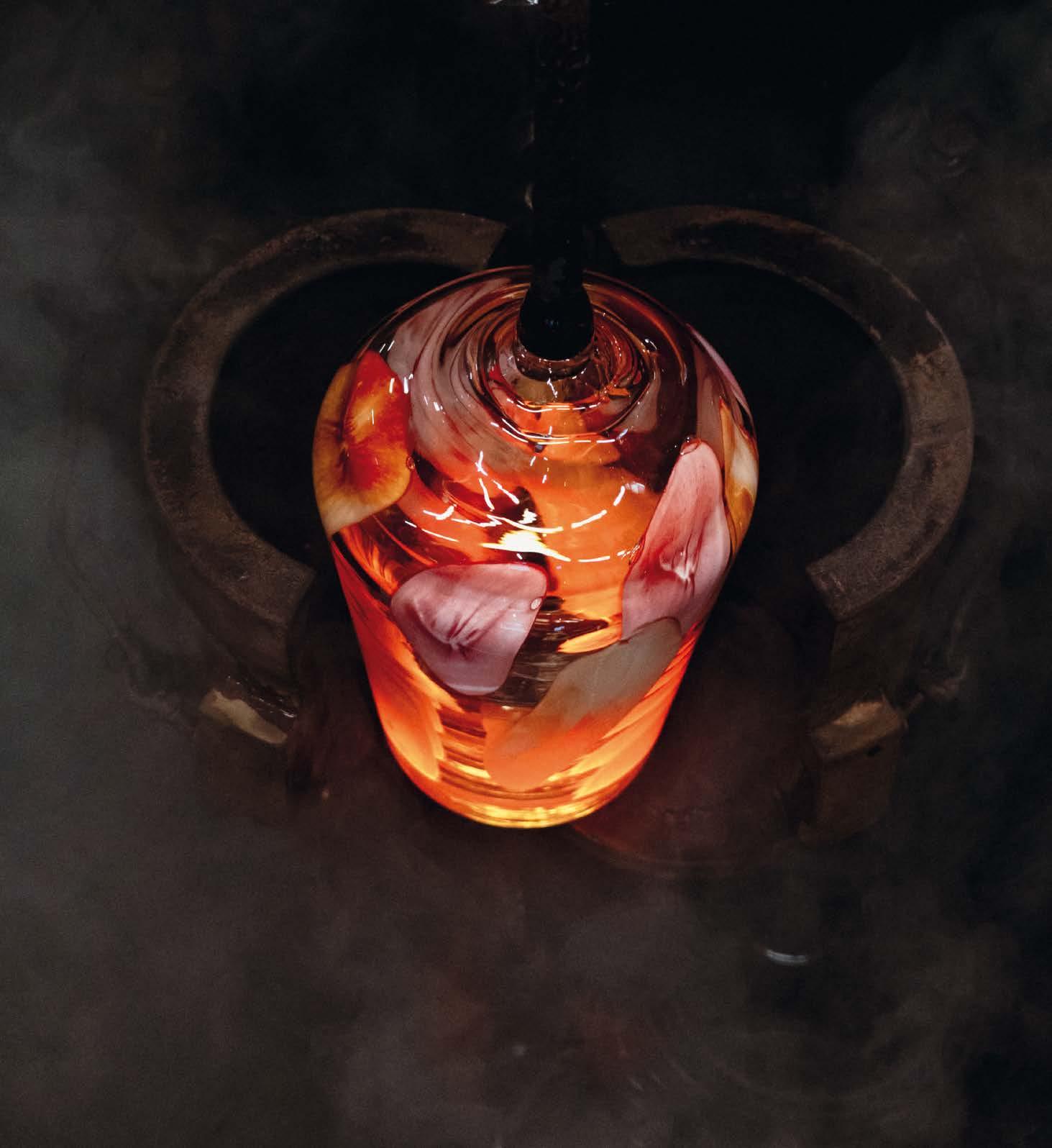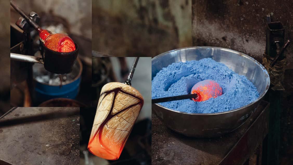 The Feathers Collection employs mouth-blown glass to reproduce patterns inspired by feathers. In models such as Feathers Original or Feathers Touareg, the coloured glass confetti generates effects that evoke ethereal plumage. This production method, virtually unchanged for more than 2,000 years, remains one of the pillars of Baobab Collection’s savoir-faire.