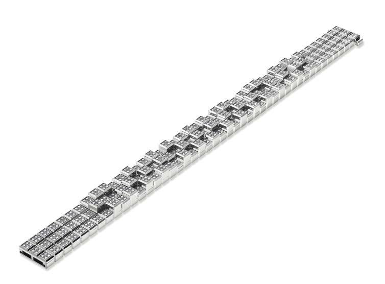 En el corazón de la colección se encuentra un collar único y transformable, con una silueta dinámica, compuesto por hileras articuladas de cubos de oro blanco y rosa ético.