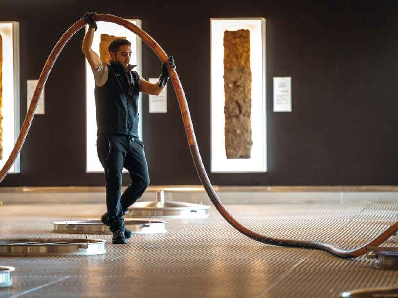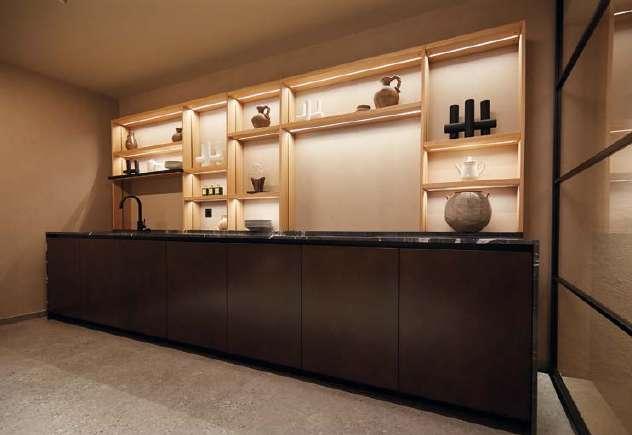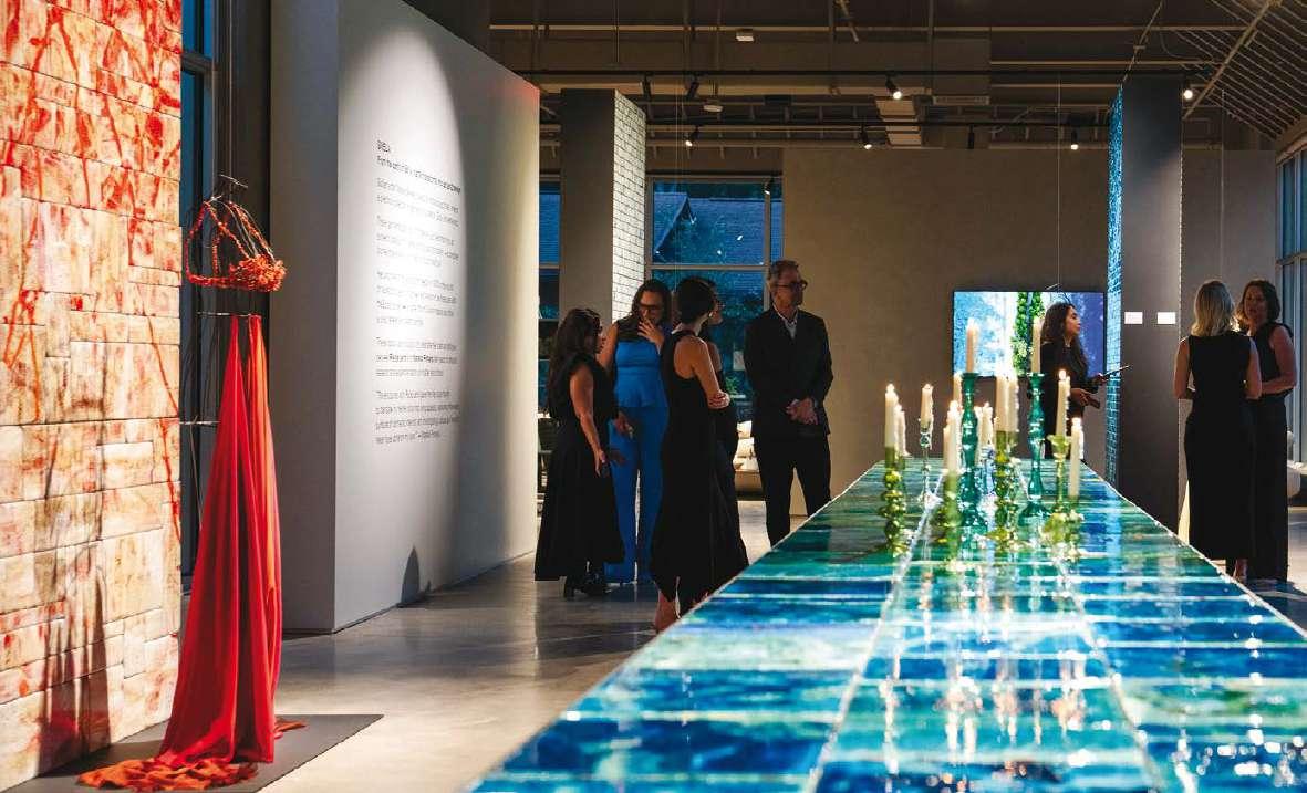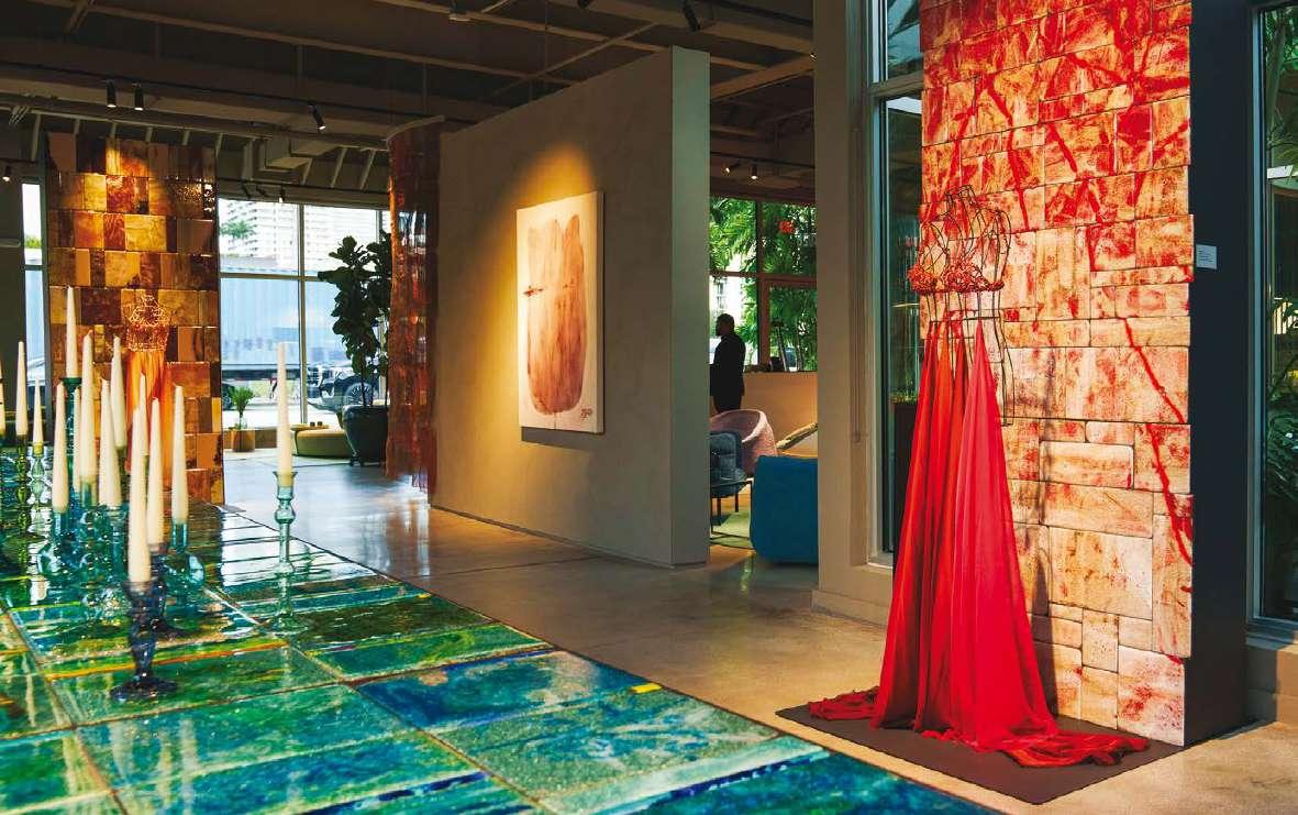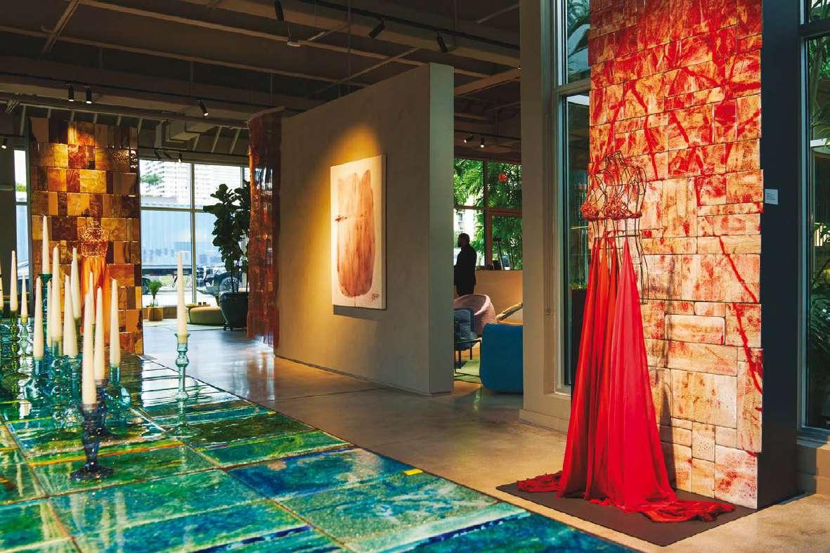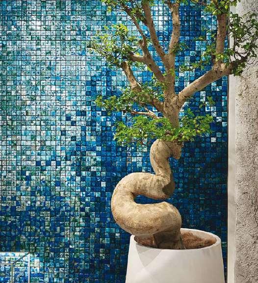 The Sciara walls on display reflect different chromatic and compositional approaches. The result of a decade of research, each wall explores how the size, arrangement and tonalities of the tiles can generate infinitely customisable surfaces, evoking the expressive power of a painted canvas. For this occasion, the visual strength of Sciara defines Paola Lenti’s design through the special project The Sea of Sicily: three large specialedition tables forming a chromatic continuum with which Marella Ferrera celebrates the island’s coastal waters.