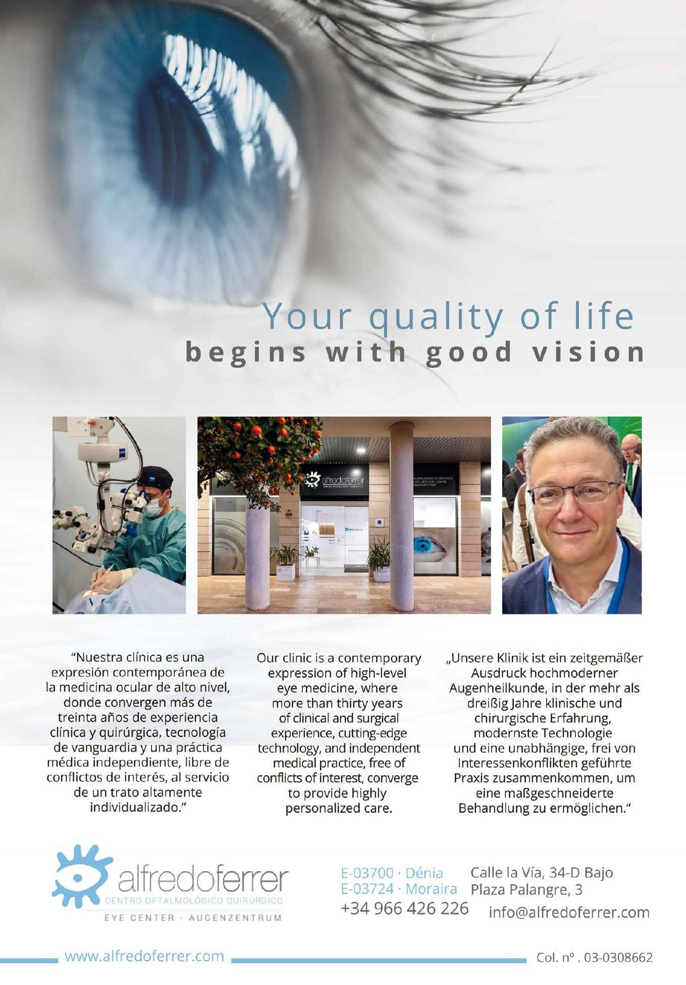 El Dr. Alfredo Ferrer, formado en las universidades de Valencia, Saarland y Bonn, y especializado en Oftalmología y Cirugía Ocular en Bonn y Colonia, se establece en España en 1999, y en 2007 inaugura su nuevo Centro Oftalmológico Quirúrgico en Denia, con un equipo médico y medios técnicos del máximo nivel, especializado en Cirugía de Cataratas y de la presbicia con lentes intraoculares avanzadas, Cirugía Refractiva, Cirugía del Glaucoma con Microimplantes, Degeneración Macular, Cirugía de los párpados, Alteraciones de superficie ocular y Síndrome de ojo seco, y Oftalmología general e infantil. Más de 15.000 intervenciones quirúrgicas, y su pertenencia a sociedades académicas internacionales como la Deutsche Ophthalmologische Gesellschaft, European Society of Cataract and Refractive Surgery, o la Sociedad Española de Oftalmología, y la participación como docente y ponente en congresos nacionales e internacionales, prestigian su trayectoria. El pasado año, la Sociedad Alemana de Oftalmocirugía le concedió la Medalla de Bronce en el 36º Congreso Internacional de la Cirugía Oftálmológica, como reconocimiento a sus logros y méritos especiales en este campo.