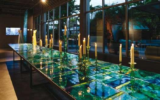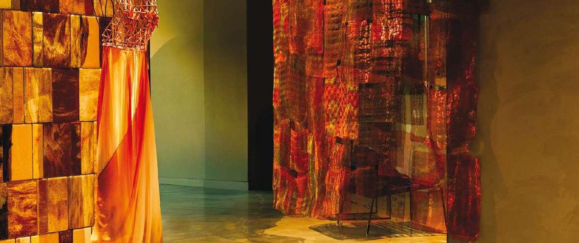 Like a snorkelling journey, the nine-metre span of the tables reveals, through fused glass, transparent waters mingling with the fine, pale sand typical of the Agrigento coast. Continuing the exploration, one reaches pebble shores where the sea deepens into saturated greens that fade into turquoise and finally into an increasingly impenetrable blue. This is the colour of the sea surrounding the Aeolian Islands, volcanic lands with almost black seabeds formed by lava.