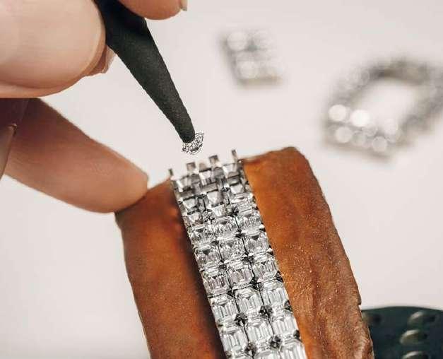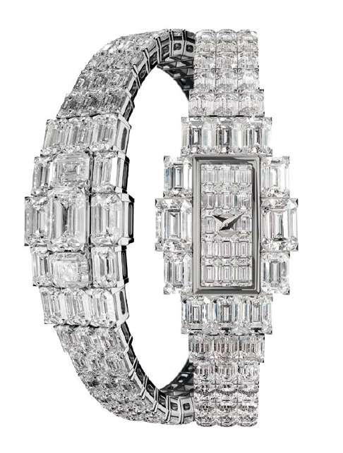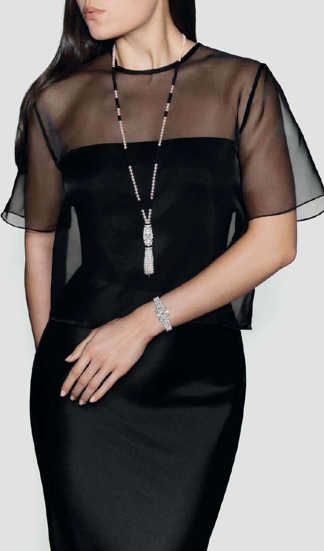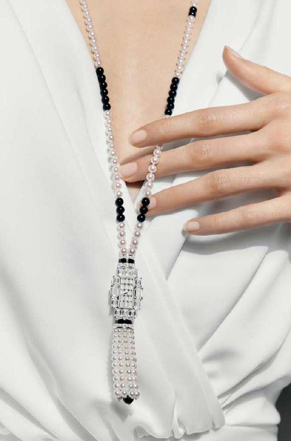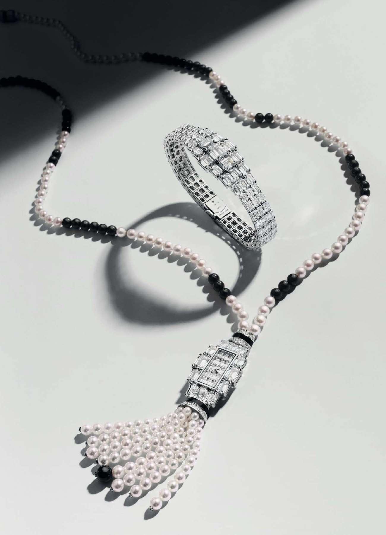 Reducidas al mínimo para dejar espacio a las agujas, son triangulares en el brazalete y en el centro de la caja para dar realce a las gemas; o piramidales para formar la emblemática cruz de Malta de la Maison, que brilla bañada de luz. El collar sautoir de ónice y diamantes, así como las borlas de perlas Akoya elegidas por su brillo y su redondez, establecen un atractivo diálogo entre el art déco y el siglo XXI