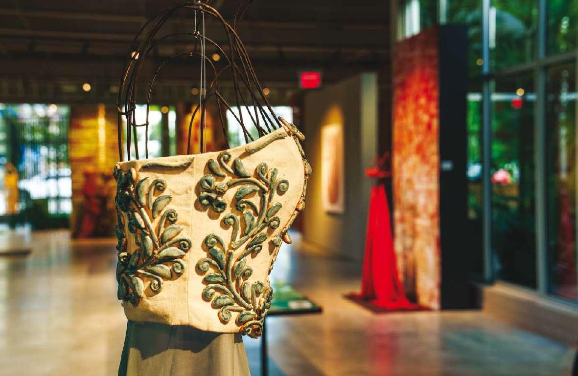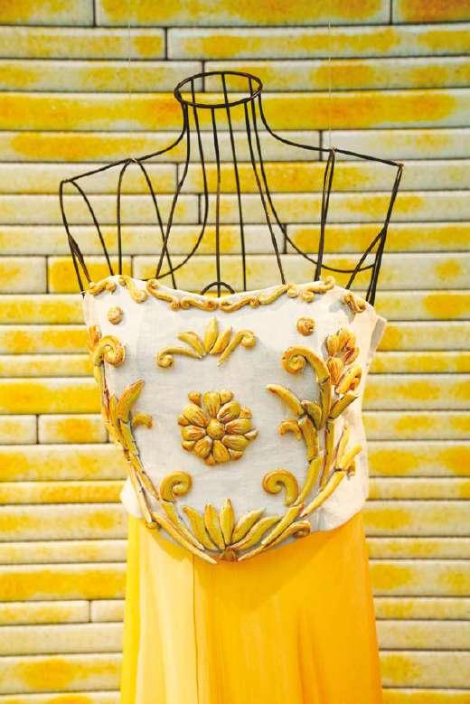 The garments tell the story of Marella Ferrera’s design research into hemp, ceramics, copper, glass, terracotta and coral: materials embroidered onto textile supports in an unconventional and artistic way.