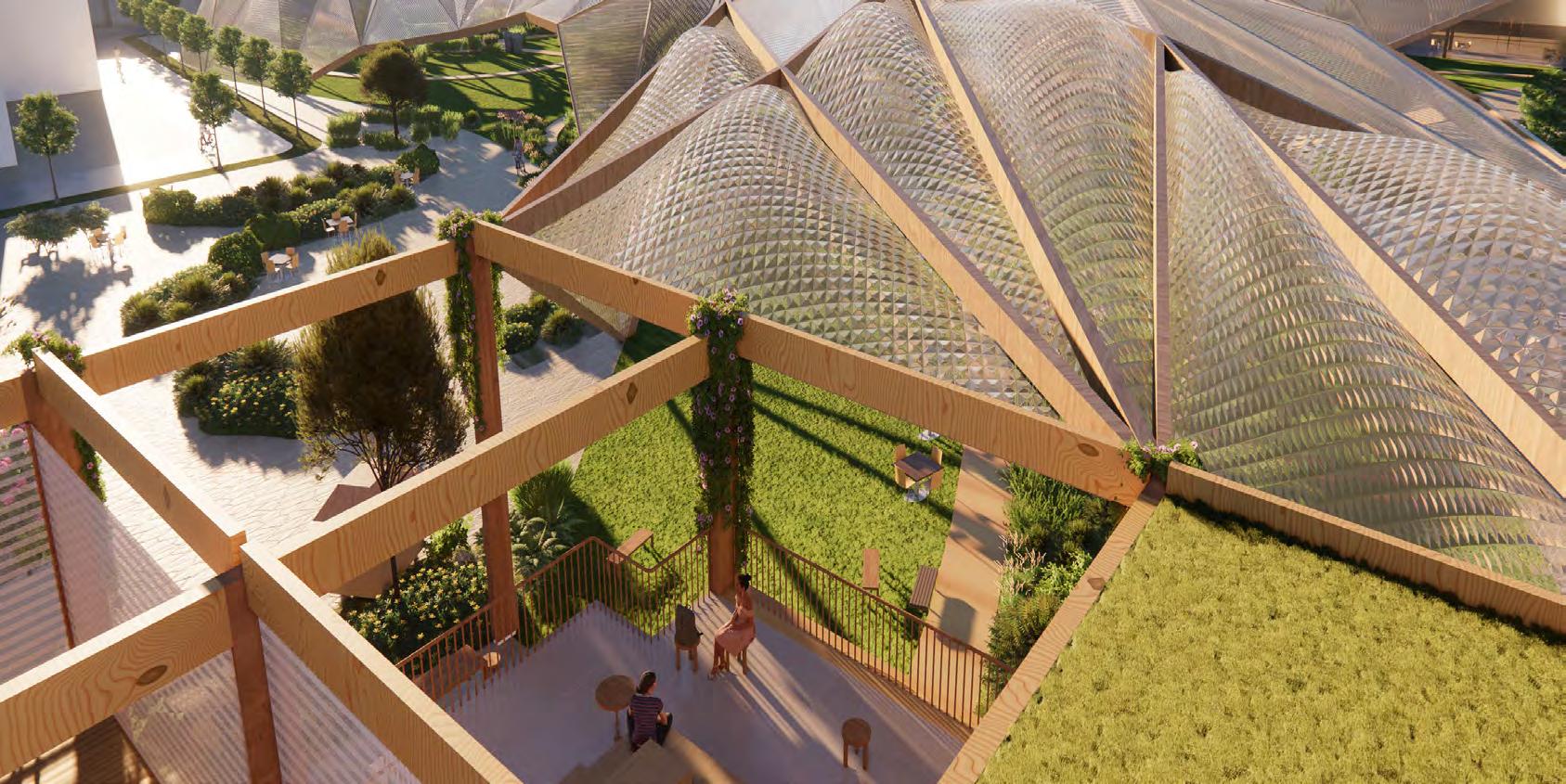 This section illustrates the intervention of rainwater collection systems and ETFE canopies, enhancing sustainability through efficient water management while creating a light-filled, resilient civic space.