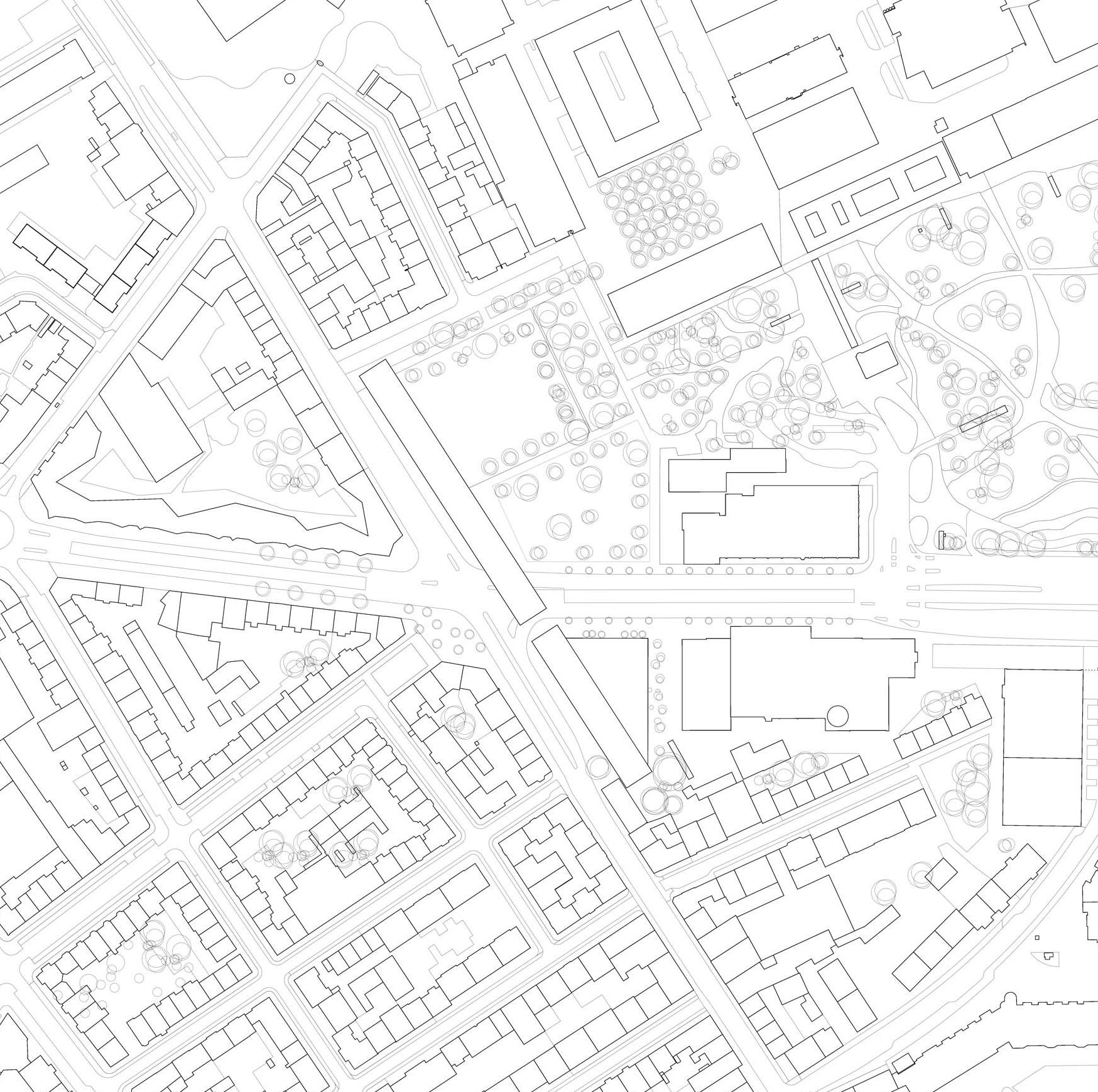 Basel needs new housing, and evidence of this can be detected in the scale of the new residential buildings, which often exceeds that of the existing context. By aligning and juxtaposing with one of these buildings under construction, the project aims to define a new urban front for Voltaplatz and thus give clearer identity to an already well-perceptible duality: to the west stands the denser, more consolidated urban area that has its center at Lothringerplatz; to the west a greener area, with pre-existing industrial buildings, that slopes down toward the Rhine. The architectural expression is a direct consequence of the structural choices: a concrete skeleton stands punctually along the park defining a very permeable limit, pivots at the intersection, and then suspends a large volume above Voltastrasse. Above and below it, a lightweight structure –¬ made of wood for the supported part and steel and wood for the suspended part – accommodates the residential and public program.