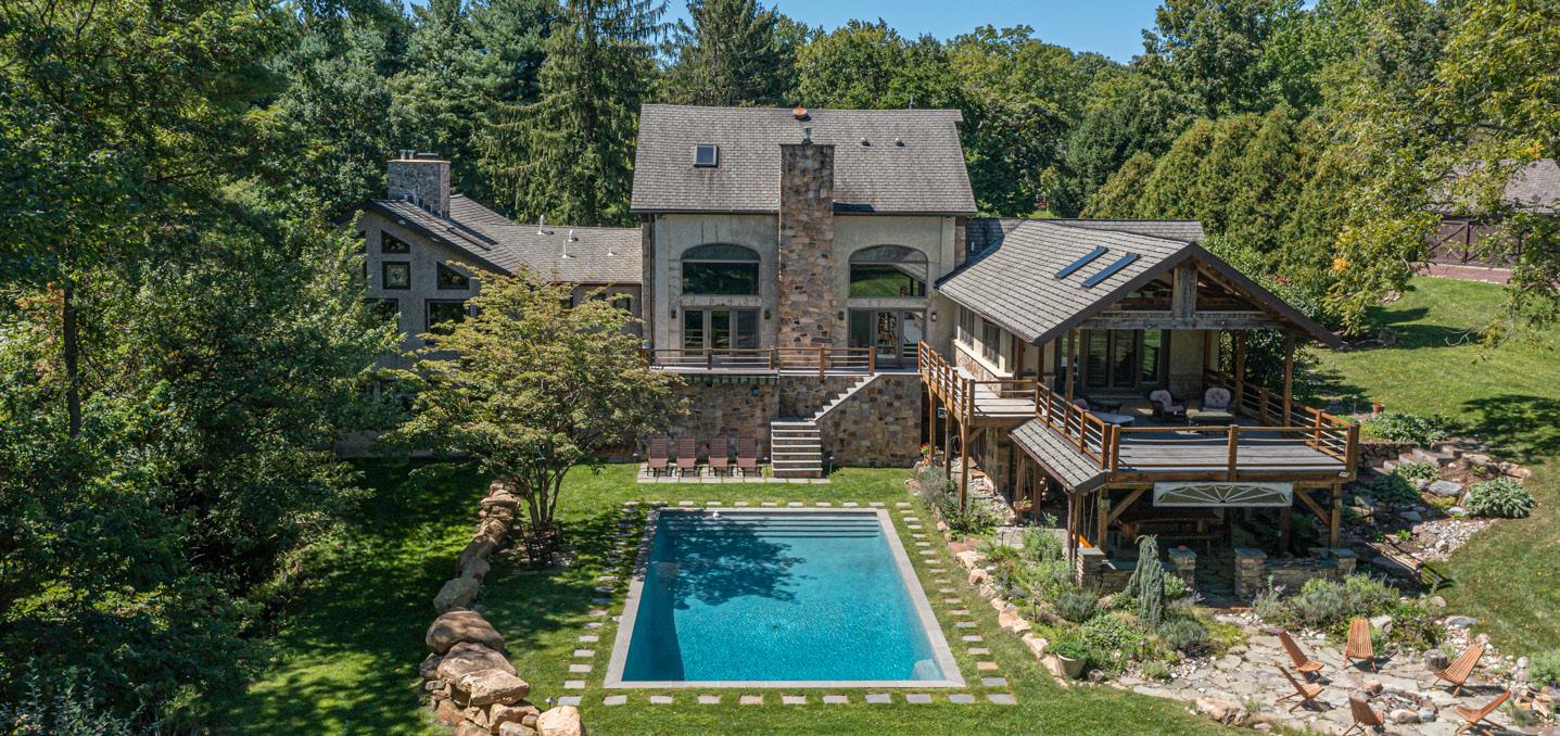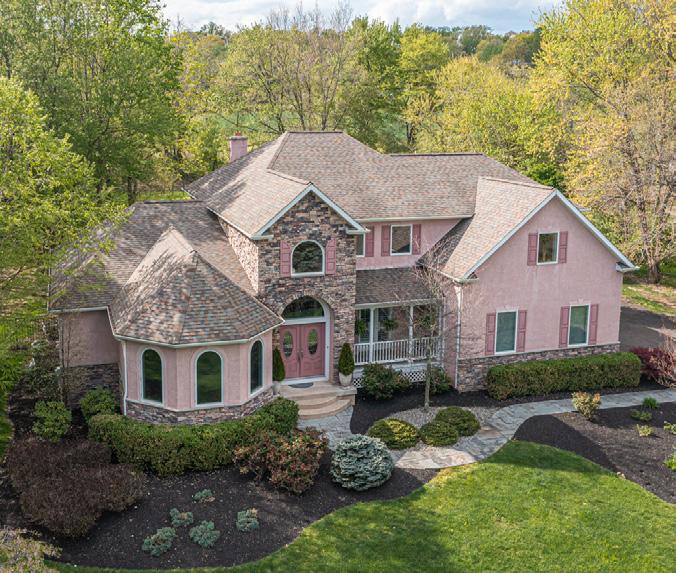 with built-in grill on one side and an enclosed wood-lined ceiling patio on the other. Elegant details such as arched doorways, transoms, skylights, extensive moldings, hardwood floors and beautifully designed outdoor living spaces including a pergola covered deck and gazebo by the pond will welcome you at every turn. Enjoy roaming the lush, landscaped grounds connected by blue stone walkways, standing on the dock and feeding the koi or paddling in the pond to your very own island. With a 3-car garage, generator and located in award-winning Central Bucks School District, this exceptional estate offers unparalleled luxury and tranquility just minutes from Doylestown and New Hope for dining, nightlife and shopping and is conveniently situated for access to Philadelphia, New Jersey and New York. Schedule your private tour today. ●