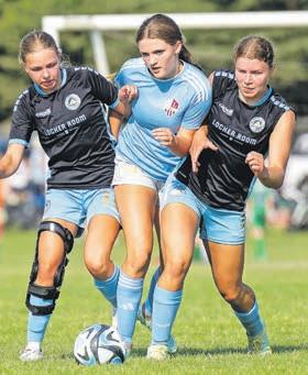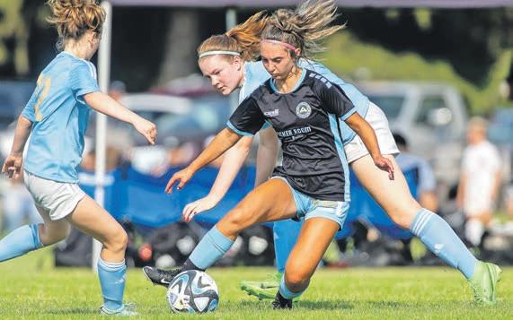 Lynden sophomore Blair Dowdy, above, reverses the ball between two Bellevue United defenders.