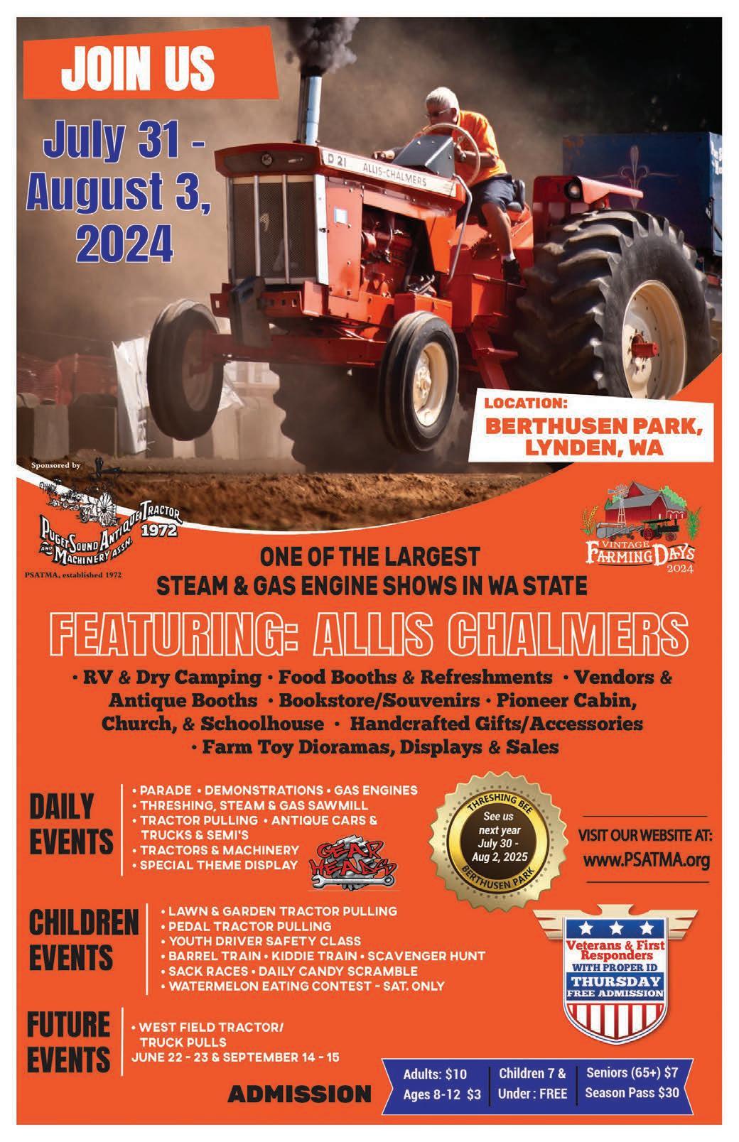 Machinery Association (PSAT&MA) will sponsor its annual Vintage Farming Days even, July 31-Aug. 3 at Berthusen Park in Lynden. Look at old-fashioned tools and equipment used for farm production. A few of the many activities include a parade, candy scramble, threshing, steam and gas sawmills, demonstrations, gas engines, tractor/lawn mower pulling, antique cars, trucks, tractors and machinery, farm toy displays and antique booths and vendors. Daily events, featured events, children’s events. For more information, visit psatma.org.