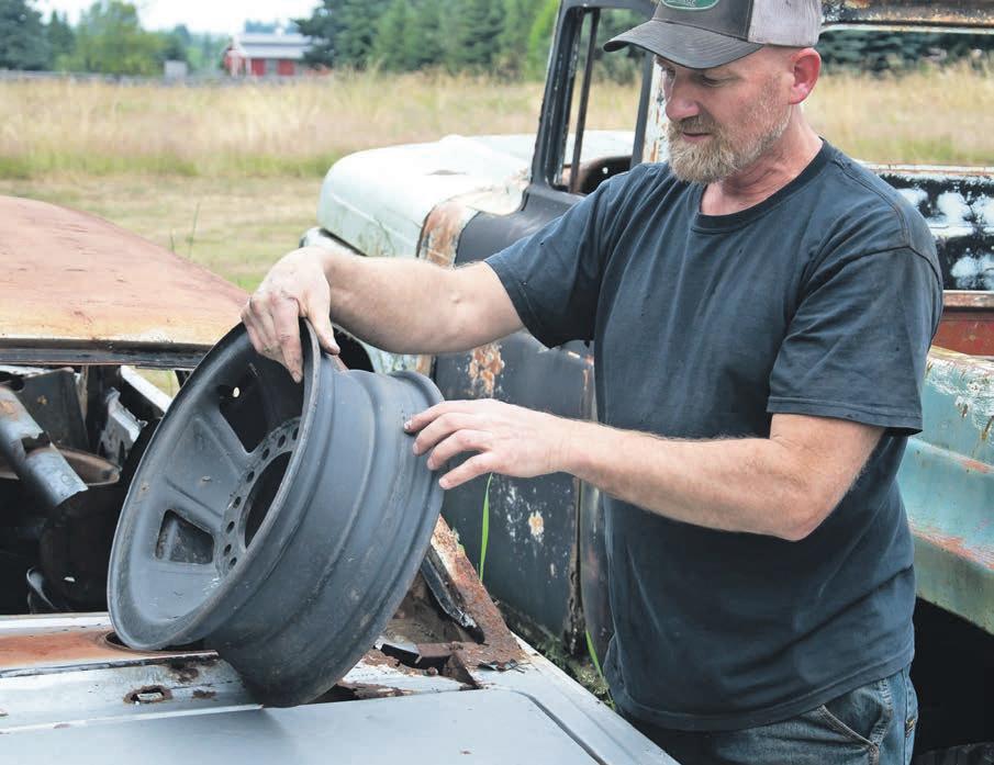 Above: Ben Lagerwey uses a tractor to move one of several car bodies scattered across his field.Opposite page: Ben Lagerwey and other derby contestants will compete at this year’s demolition derby on Aug. 7-8 at the Northwest Washington Fairgrounds. (Joe Kramer/Lynden Tribune) micromanaging them.