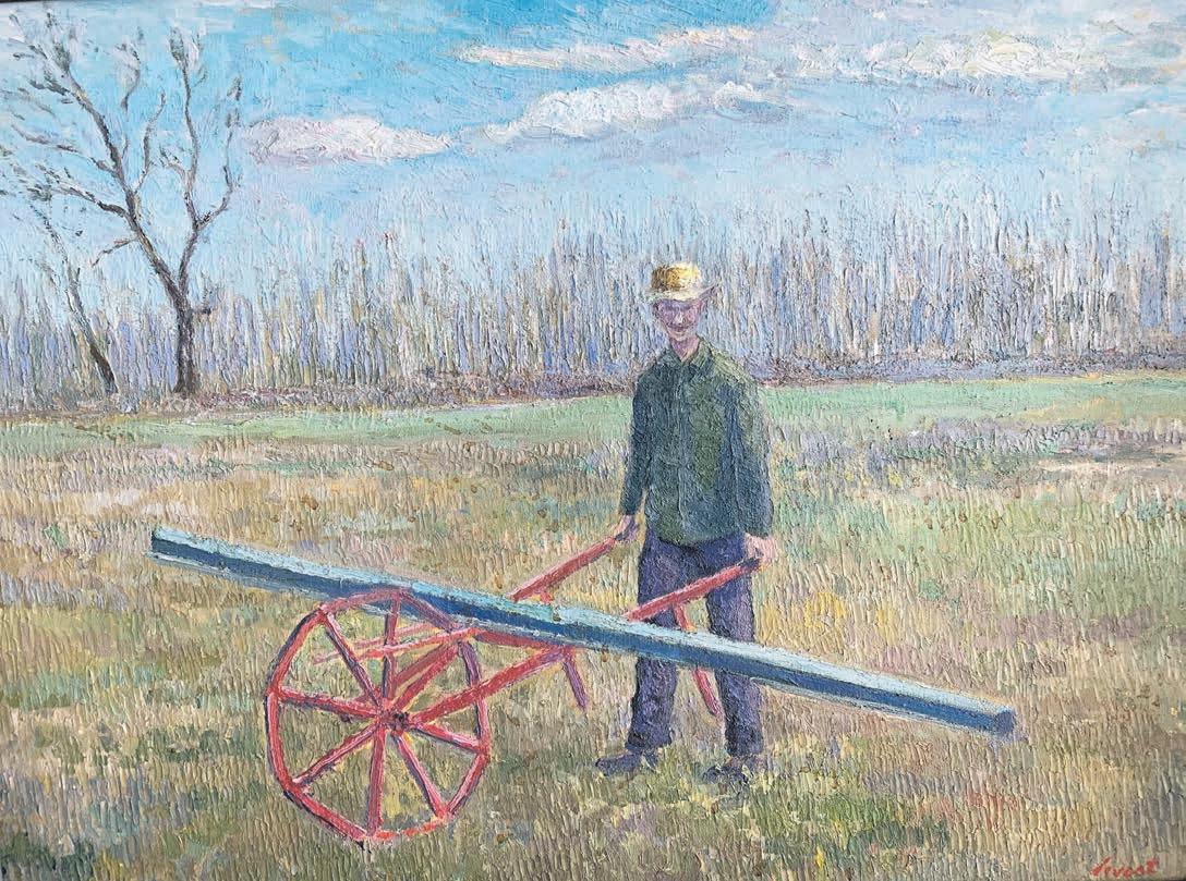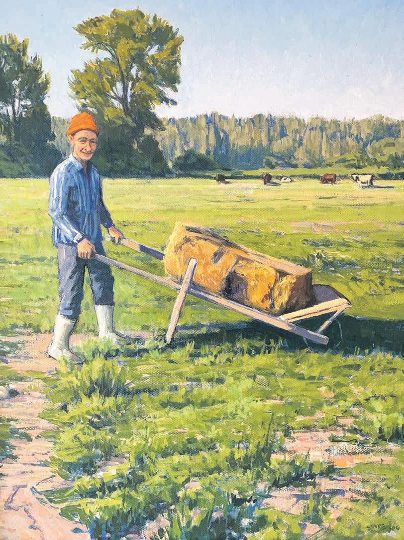 Clad in his orange cap, Donald Noteboom is shown in TJ Lynde's painting pushing a wooden wheelbarrow.rietta.
