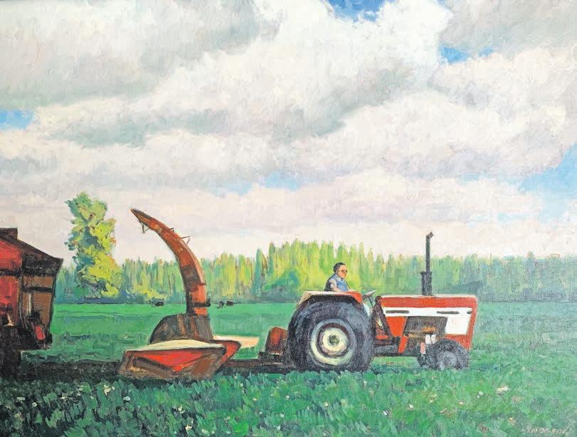 TJ Lynde also painted this piece, showing Daniel Noteboom driving his Case International tractor and pulling a flail chopper. The same tree can be seen in the background of several of these paintings, a landmark on the Noteboom family farm.