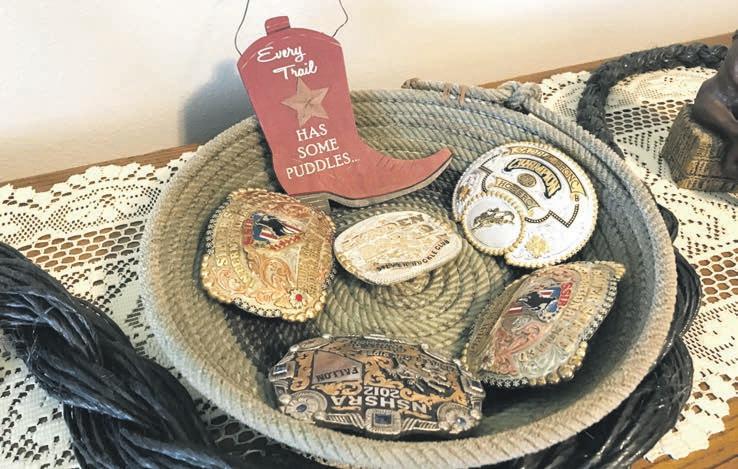 Antlers of an elk and the skin of a cougar, both shot by the Bogaards’ grandson Cole Stremler, have a prominent display spot above the main stairway to the second oor. Among the guest rooms there, one is called the Cowboy Room and is entirely decked out on that theme.