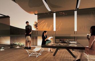 Various materials complement each other. The light glass dispels the heavy marble, just like the agility of female designers and the majestic momentum of their design works. Onyx represents the historical sense.