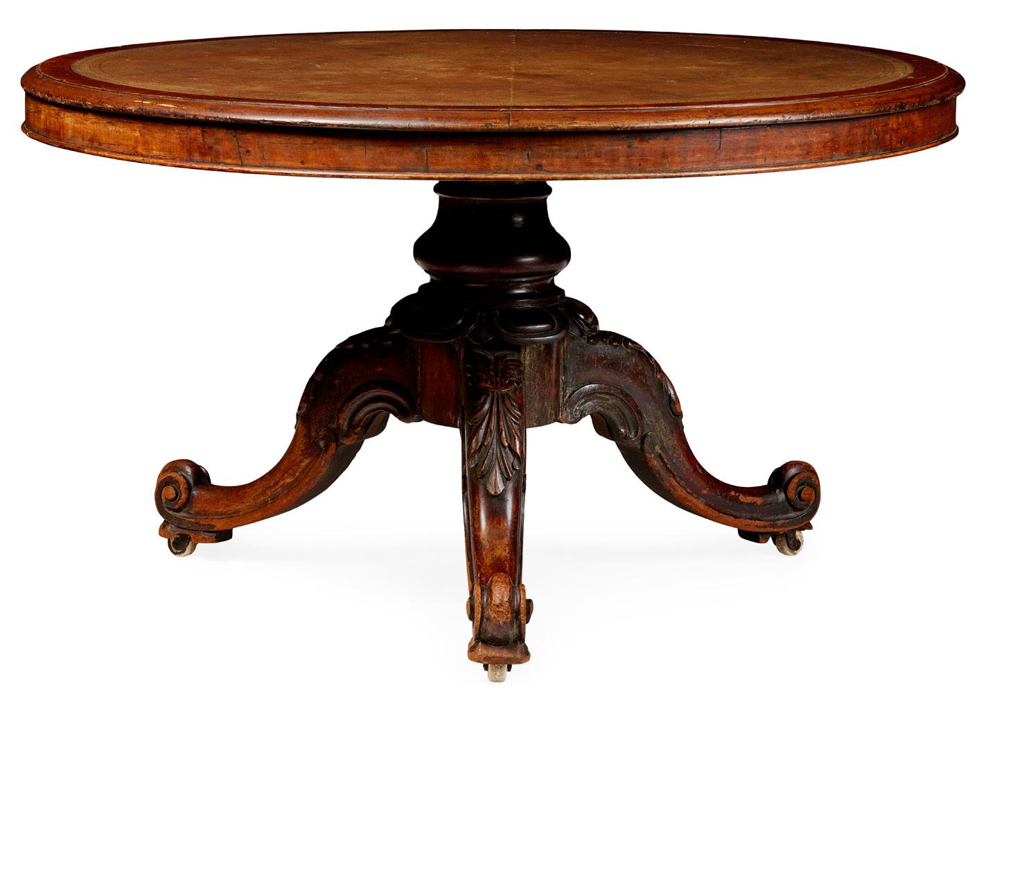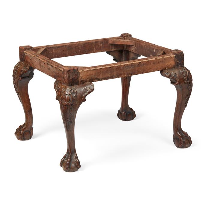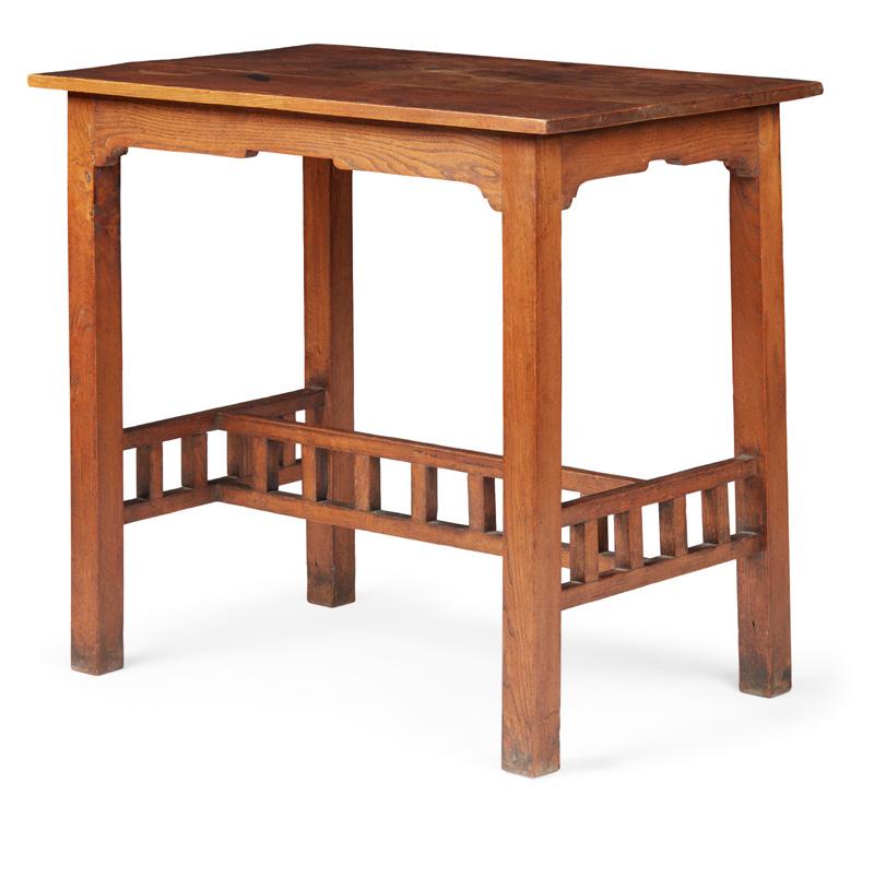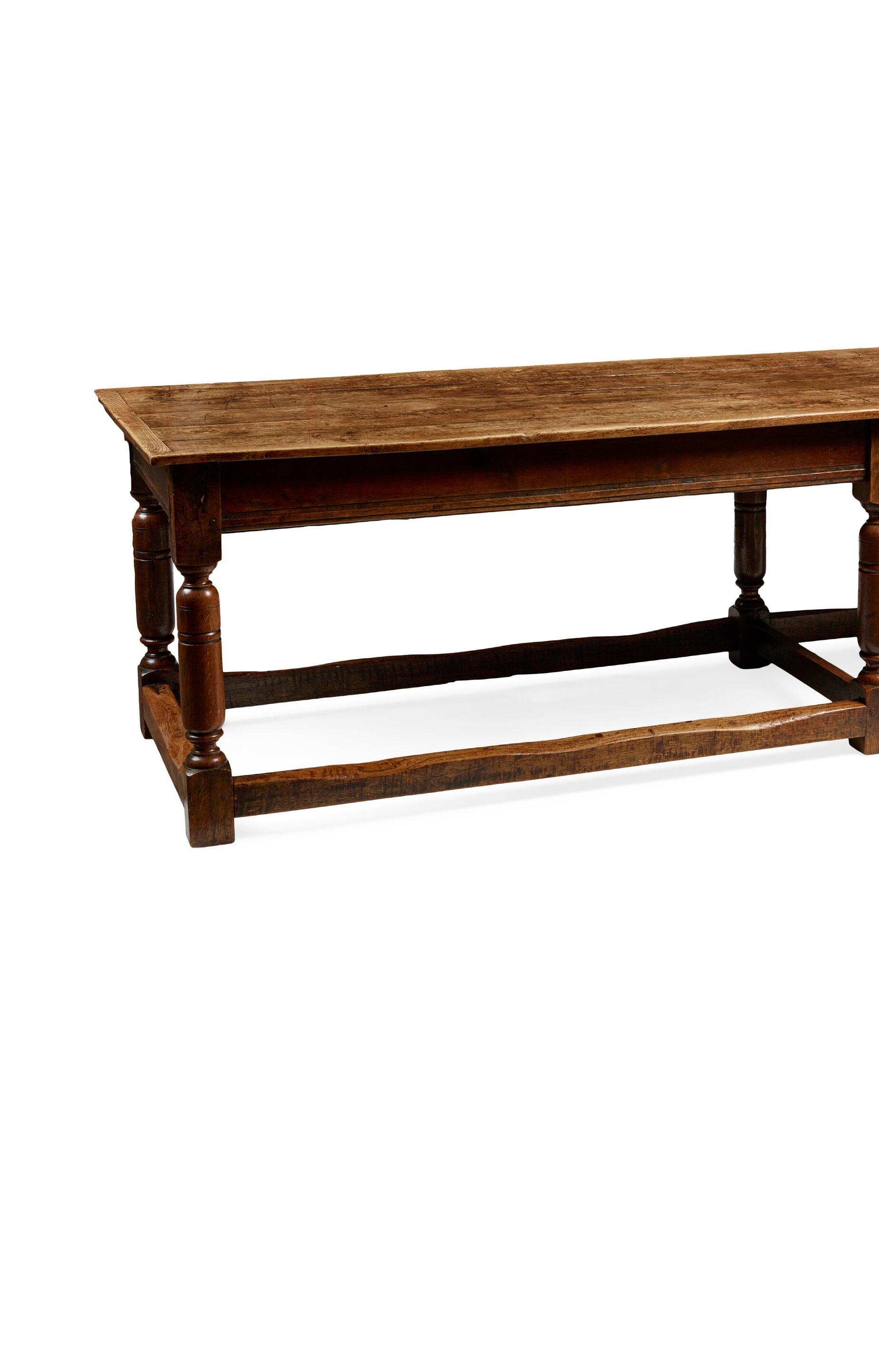 the plank top with a thumbnail edge, above a leafy lunette carved seat rail on turned and tapered legs joined by a peripheral stretcher