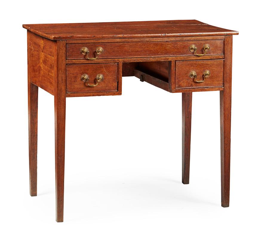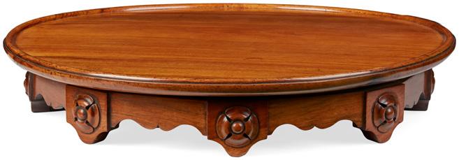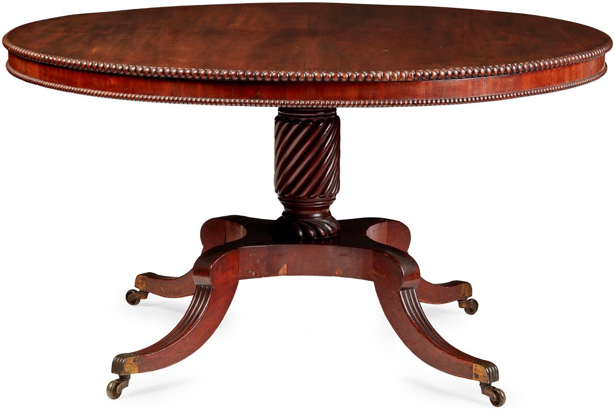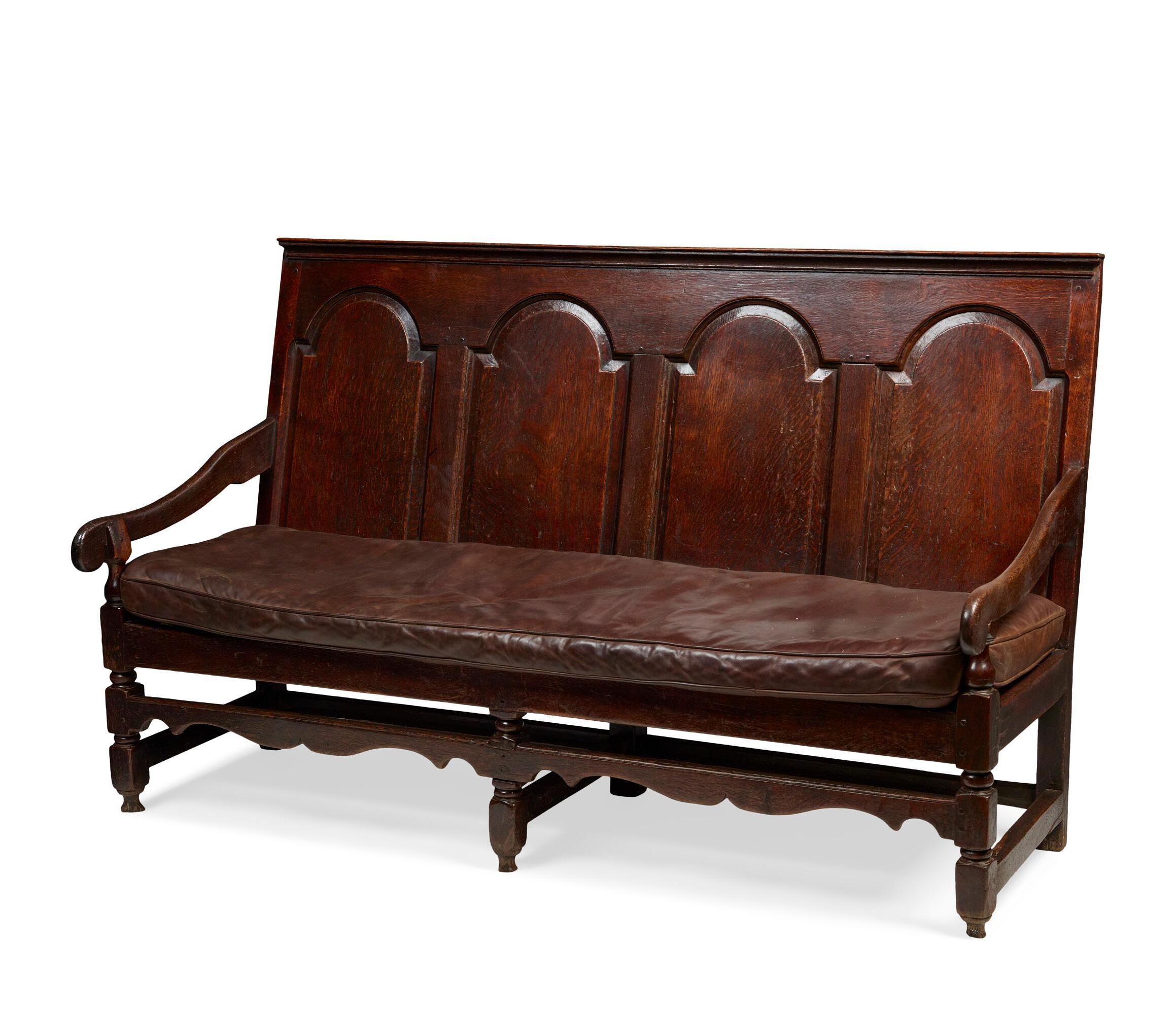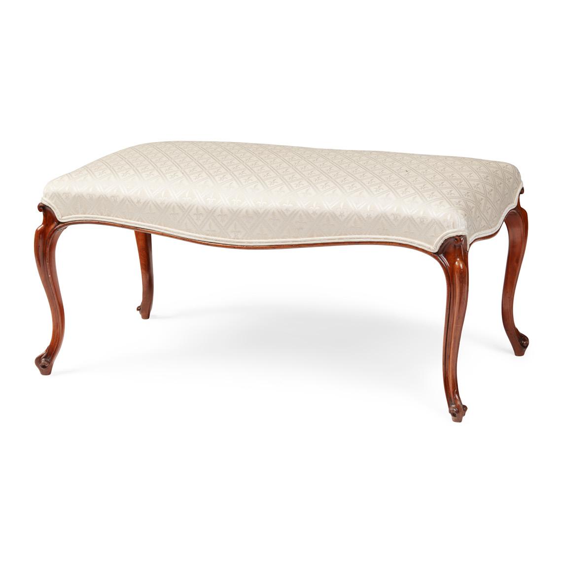 the plank top with a thumbnail edge, above a leafy lunette carved seat rail on turned and tapered legs joined by a peripheral stretcher
