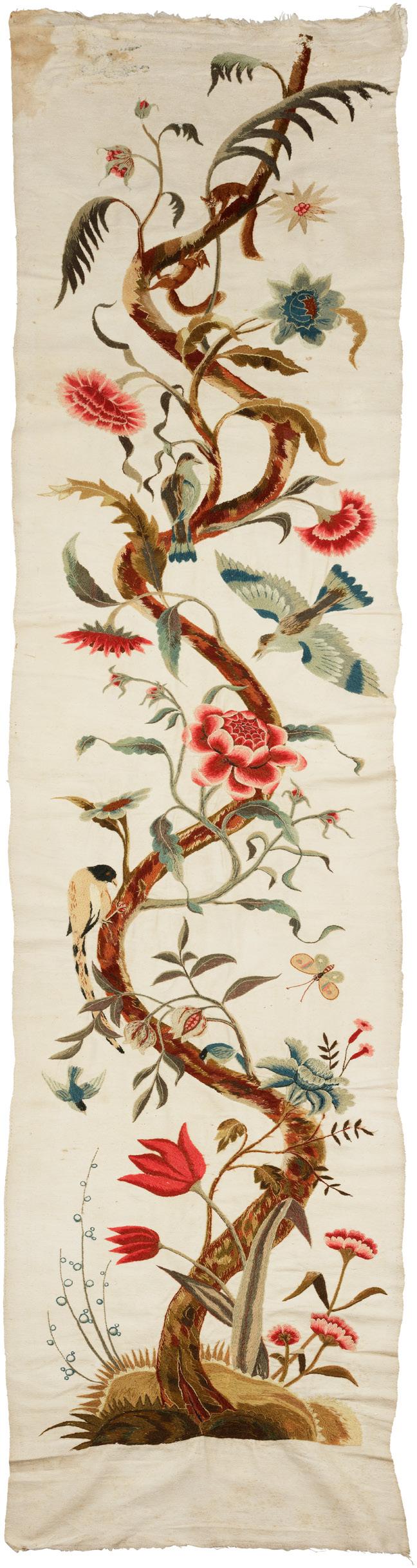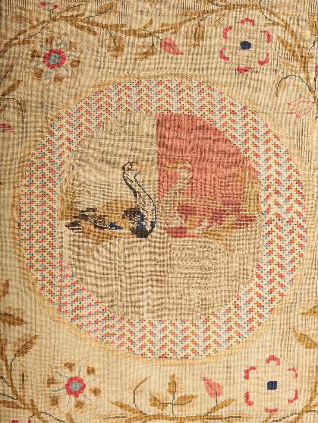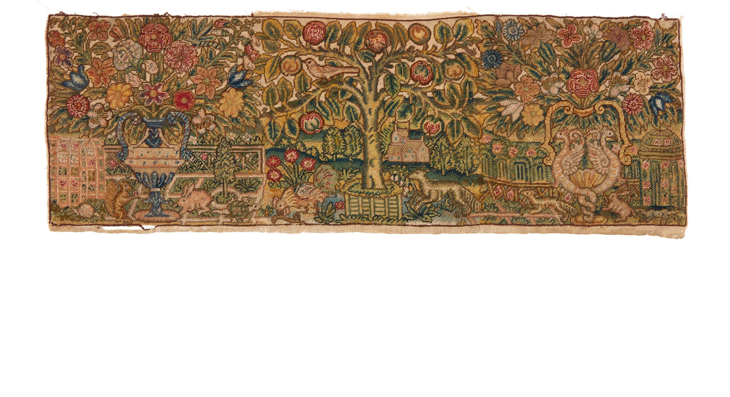 Note: This panel was originally part of a long bed valance, and the motifs employed appear frequently on valances in the late 16th and early 17th centuries. Some images, like the hen pecking the worm, appear in emblem books which were frequently used as a source for designs. These emblems were often accompanied by moral sayings or poems which would have been understood by the educated at that time. Even today we recognise ‘the early bird catches the worm’.